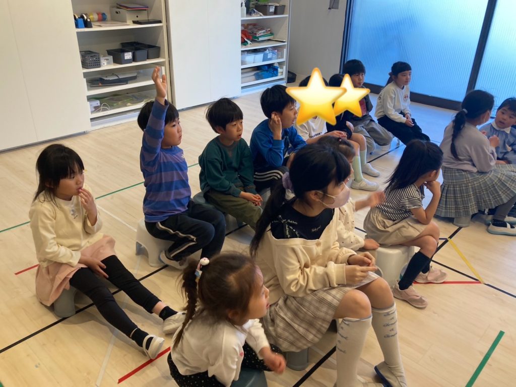 今日はメインエリアとプリエリア全員一緒にチーム対抗ジェスチャーゲームをしました!先生からお題をもらい、チームのみんなで協力してカードに書かれた動物や食べ物のジェスチャーを考えるというものです。最後には、みんなの前に出て、自分たちが考えたジェスチャーを発表しなければなりません!先輩の生徒は進んで新しい生徒に、Let’s make a circle!(丸くなって話そう!)とリードしてくれる一面も見受けられました!