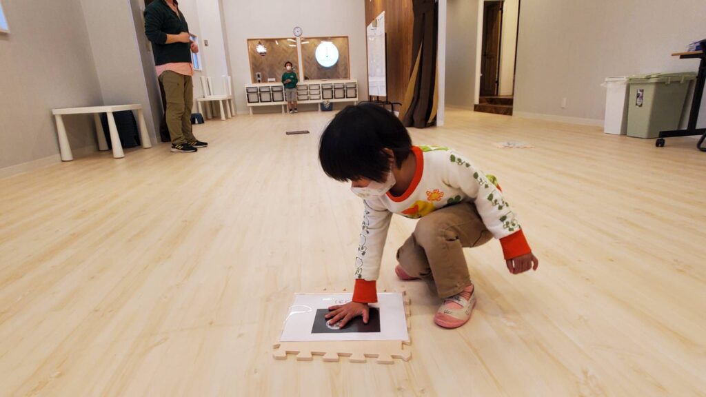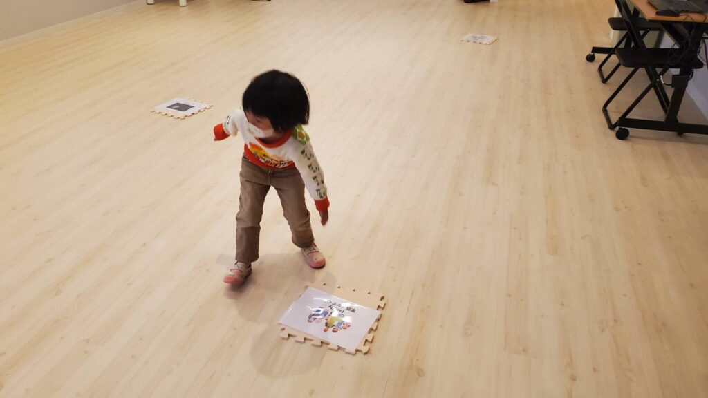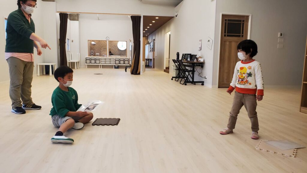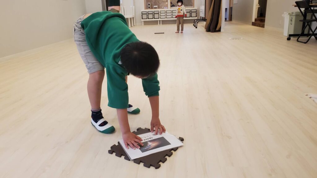 そのあとは、動きをを交えて、先生が発音した言葉のカードを探し当てるゲーム!どちらが先に見つけられたかな?