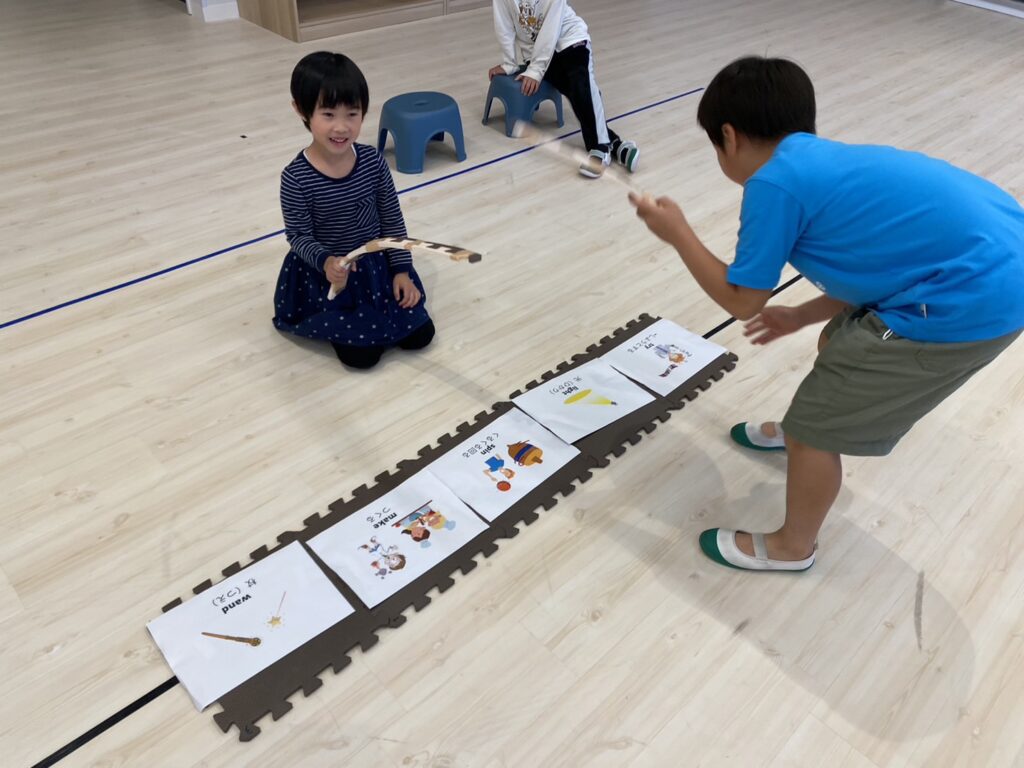 普通のカルタとは違って、聞いた英単語をスティックでたたいていきます!