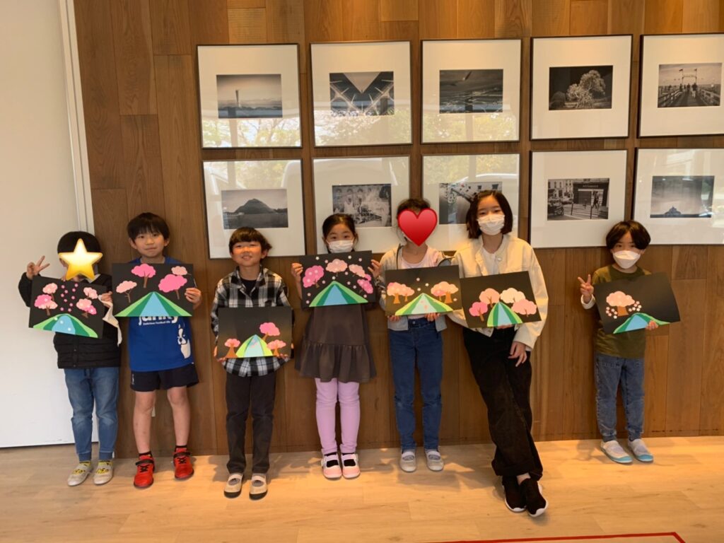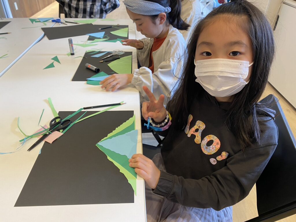 そして今日のメインは、アートクラスです!カラフルな厚紙を使って、夜に舞い散るさくらと、川のアートワークを作りました!!