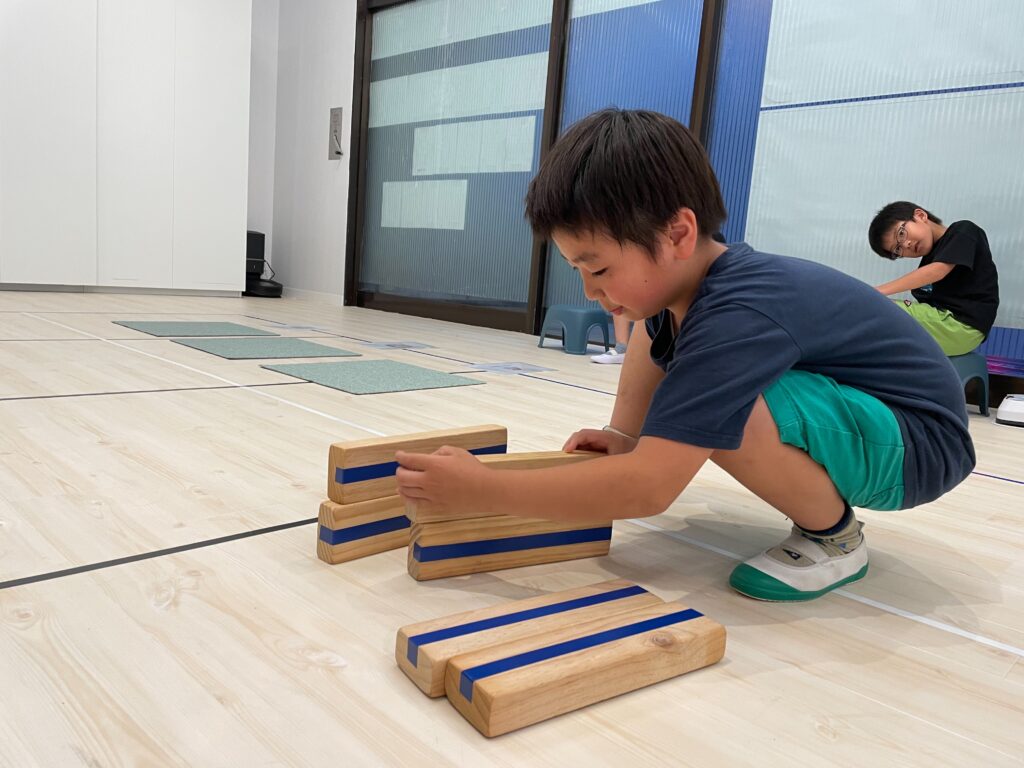 まずはブロックの中にそれぞれ1名づつ入って準備します。そしてそこから先生が英語の単語を言うのでそれにしたがってジェスチャー・アクションをします。