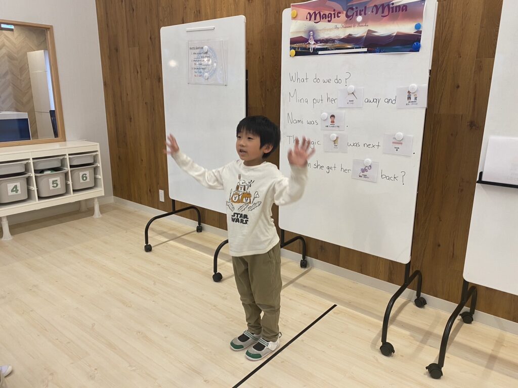 レッスンの後半、毎日みんなの前にでてストーリーの単語もしくは文章を1人で発表する機会(Story time)を設けています。