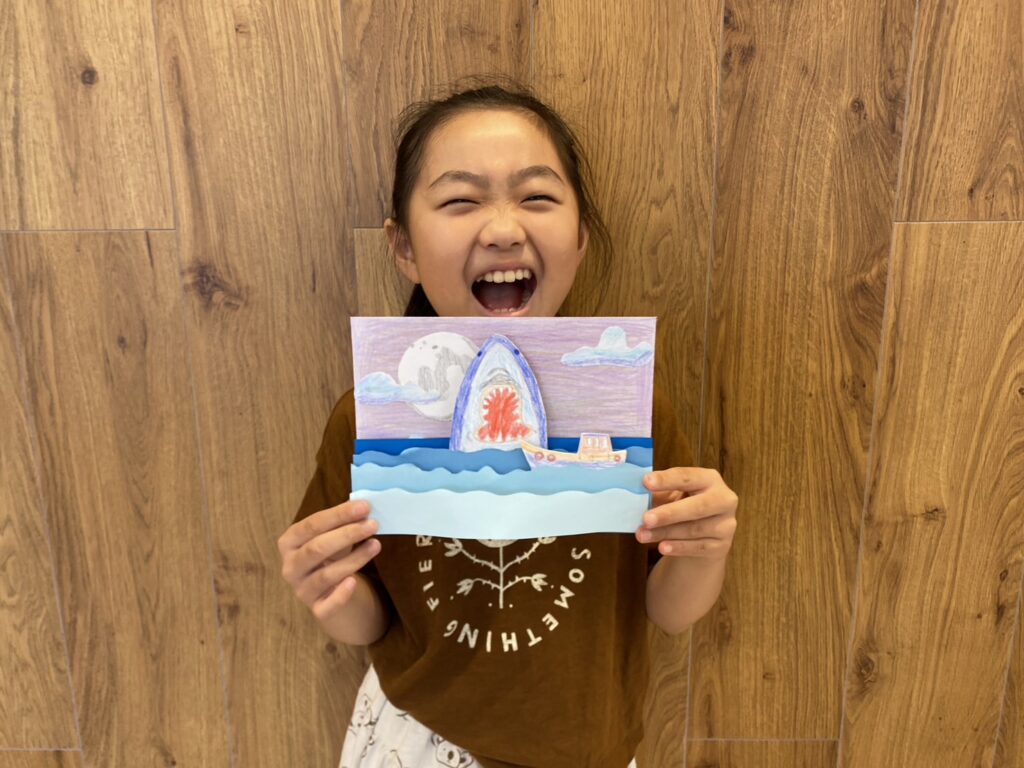 色画用紙と発泡スチロールを使って、迫りくるShark(サメ)とWaves(波)を