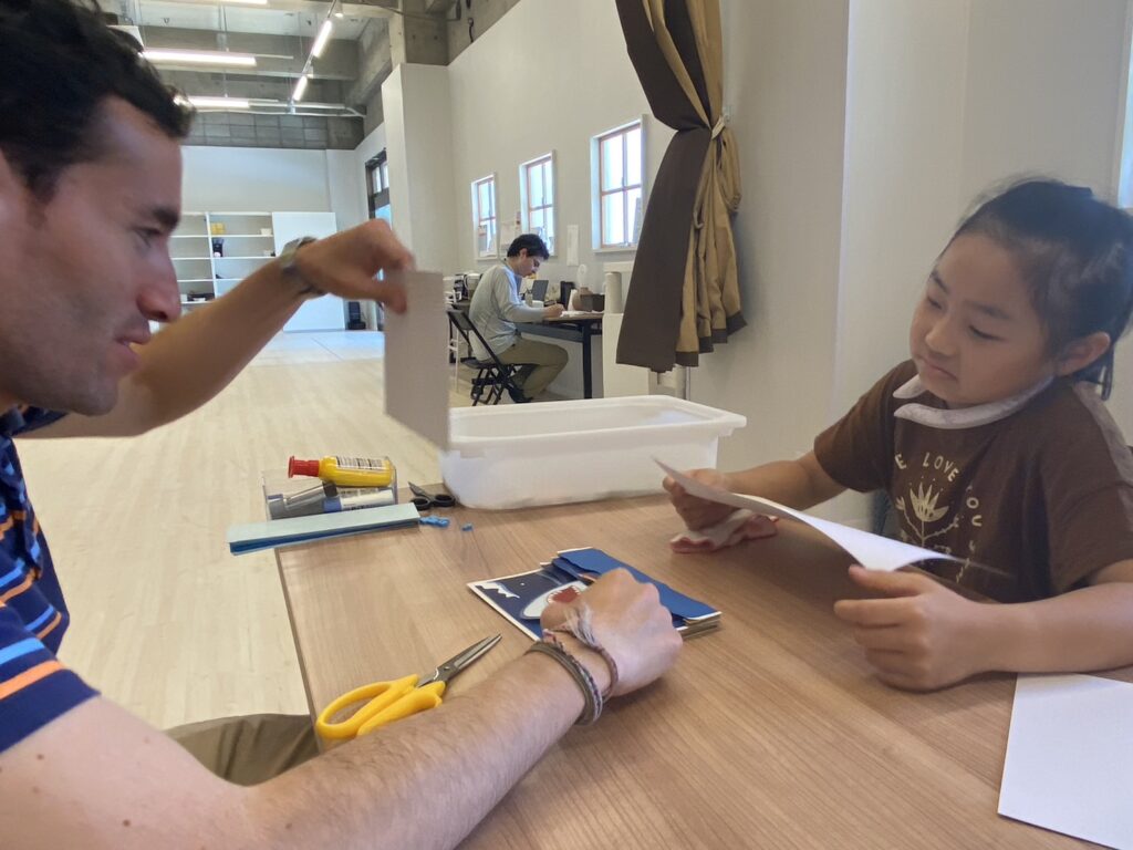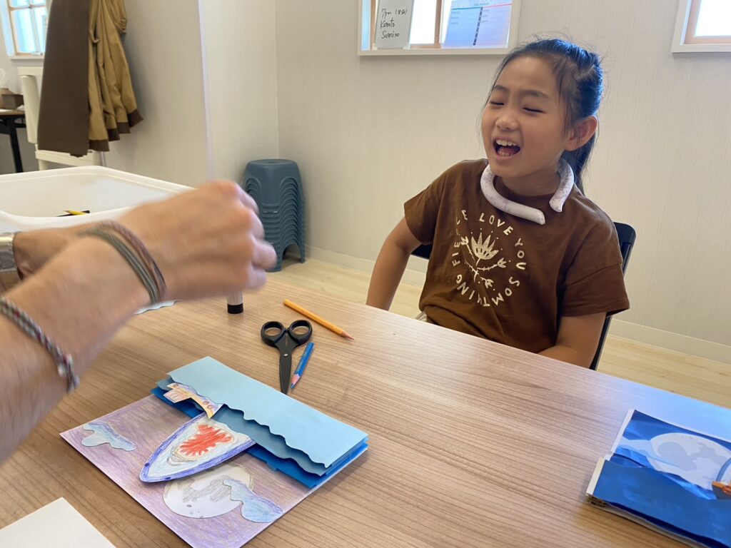 先生:Let’s cut the blue paper to make ocean waves ! この青い紙を波の形に切ろう!