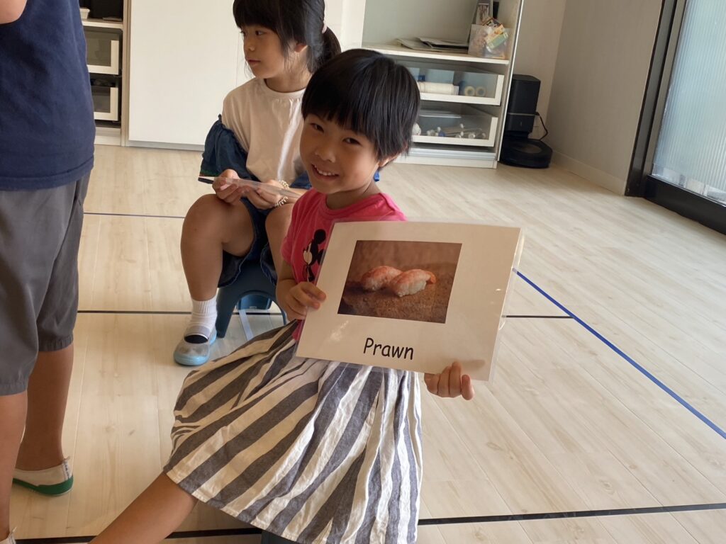 まずは英語での寿司ネタの言い方を、キャッチボールをしながら学びました!