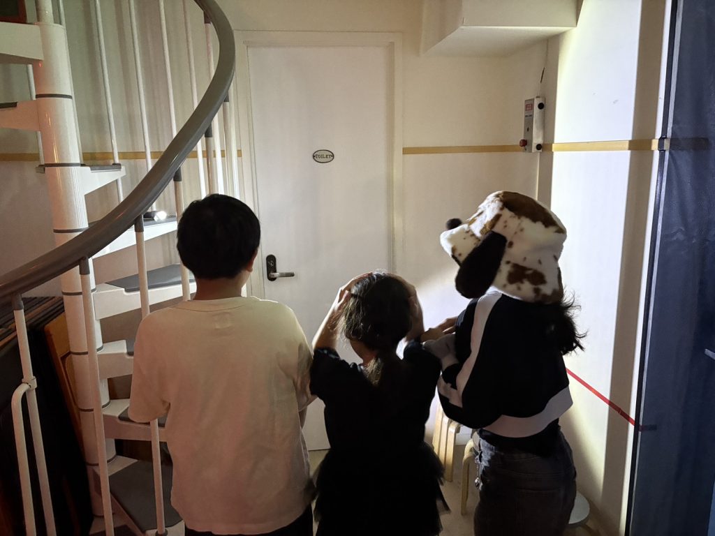 18時からのゲームタイムの時間を使ってトリックオアトリートゲームを行っています!各チームから一人ずつ前に出ていき左か右の扉を選びます!モンスターが出てきたらモンスターにじゃんけんなどで勝たないといけません。勝てると、キャンディーカードがもらえます!もし、優しい隣人さんが出てきた場合には、キャンディーカードをくれます!