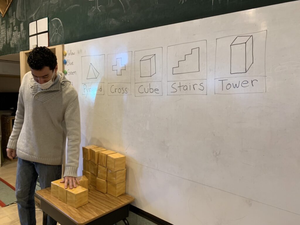 黄色のブロックを使って先生がいろんな形を見せていました
