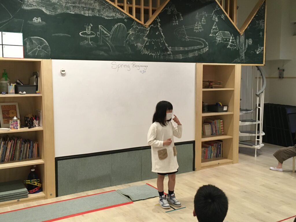 今日は冬のような寒さでしたが、春を感じるストーリーをジェスチャーつけて練習すると、、“I’m getting hot!!”(とっても暑くなってきた!)と声が聞こえきました。とっても頑張っているね!2週間後にはスピーチコンテストもあります