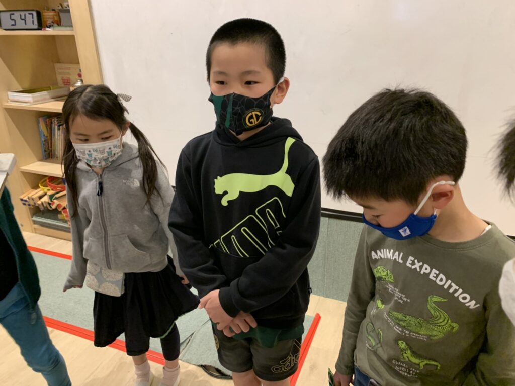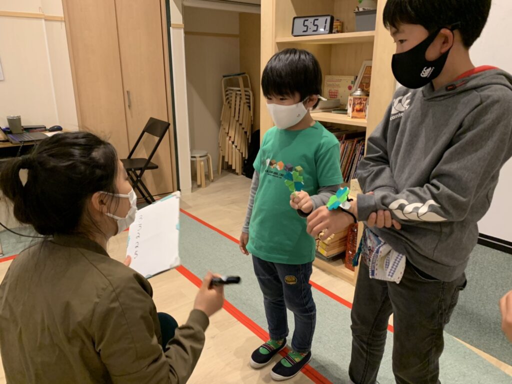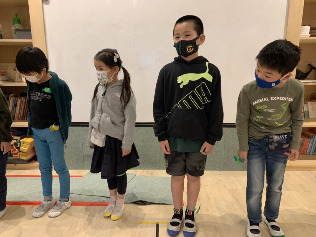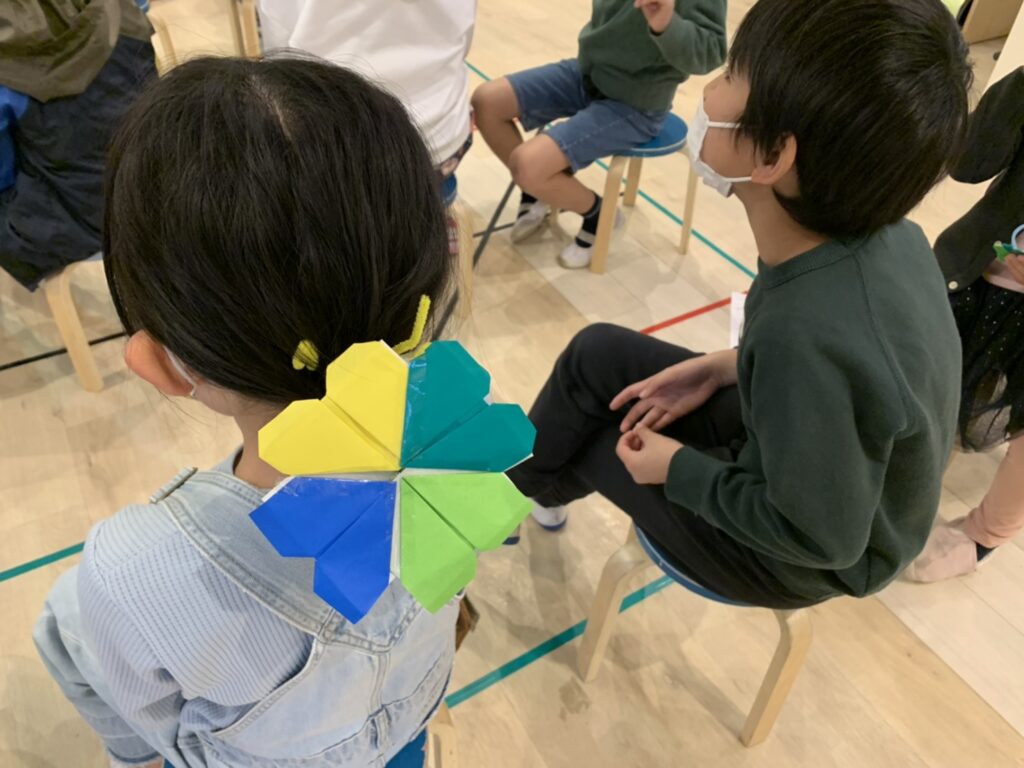 チームごとに緑のアイテムを数えて合計の数が多いチームにポイントが入るコンテストを行いました!明日、明後日もやるので緑のものがお家にあれば身に着けてきてね!