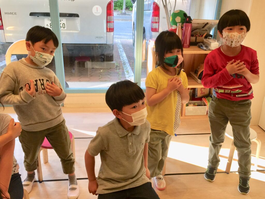 ジェスチャーをつけながら4つの天気の種類を練習しています