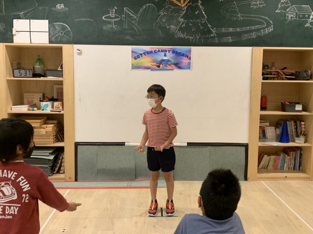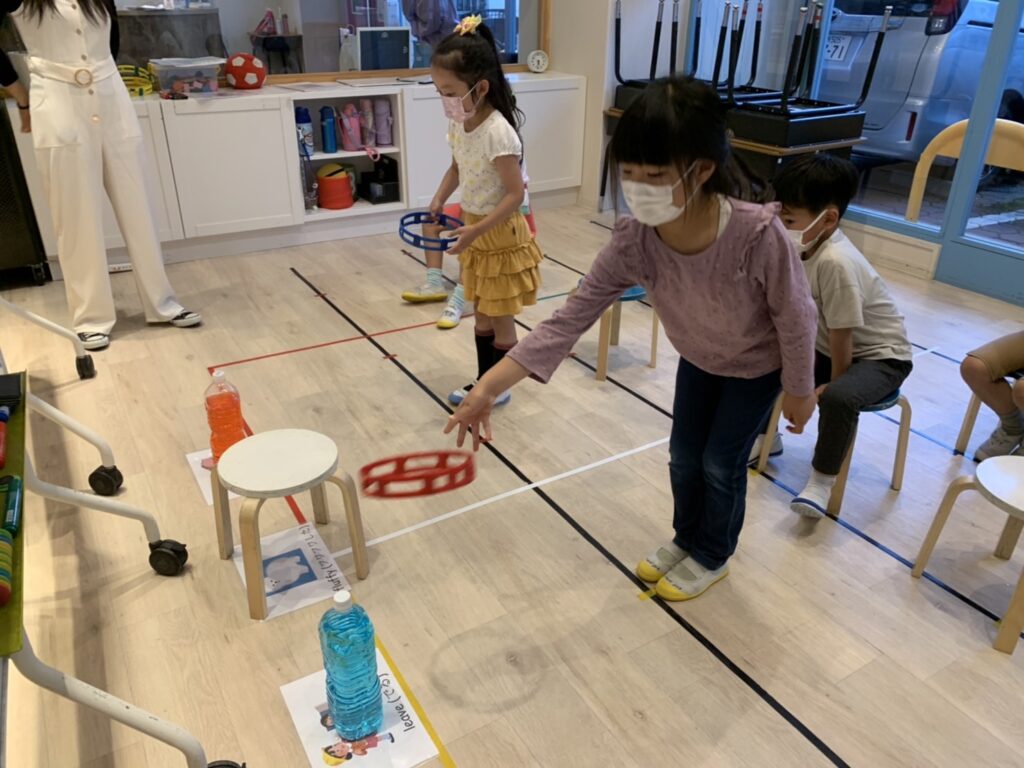 ストーリーの単語の練習の間に輪投げのゲームにもトライ!