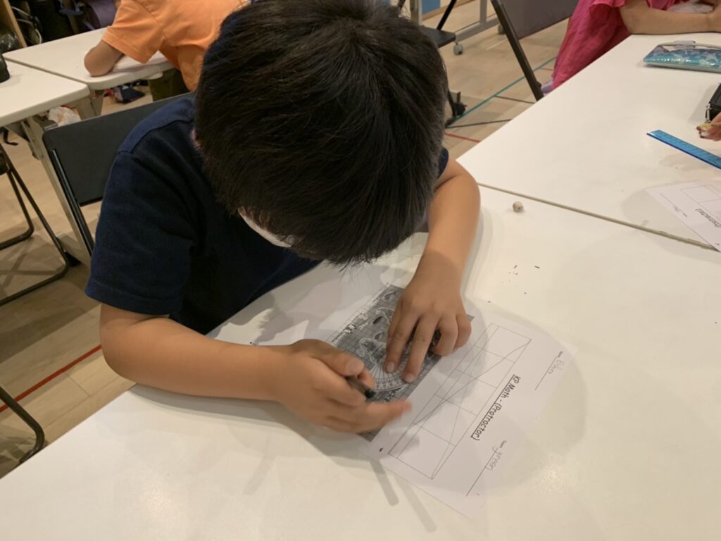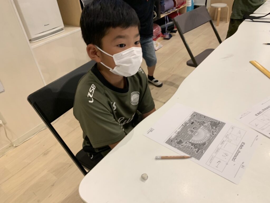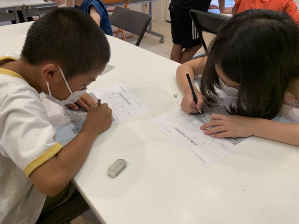 ワークショップの紙には世界地図とグリッド線が印刷されていて