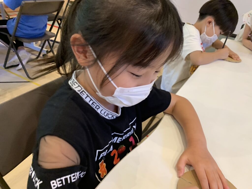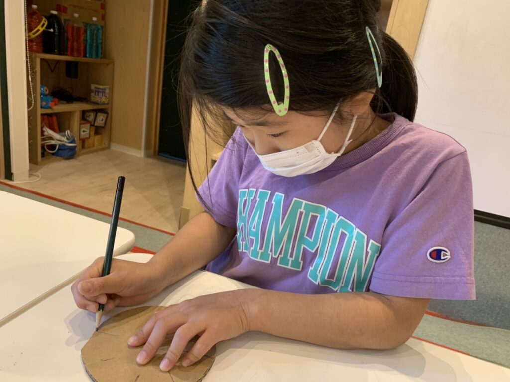 (丸い形に段ボールを切って真ん中に穴をあけ、そして均等に8等分切り込みをいれる)