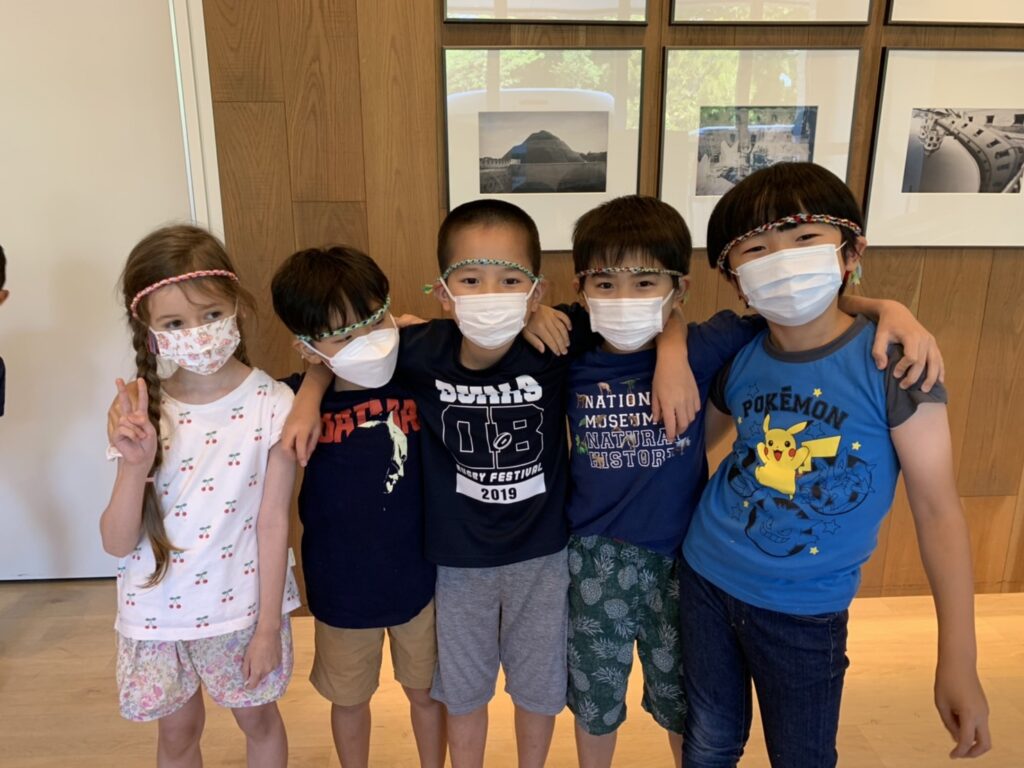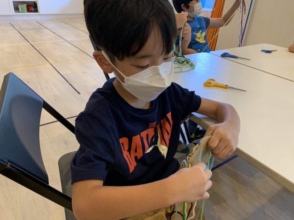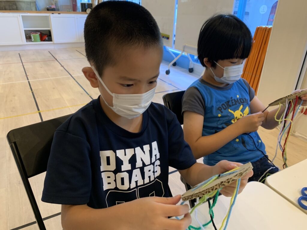(7本の毛糸を並べて端を結び、段ボールの穴に通す)