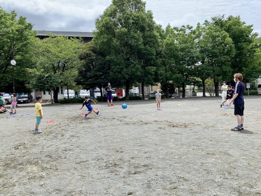 (先生がピッチャーをやるからみんなはボールを蹴ってね)