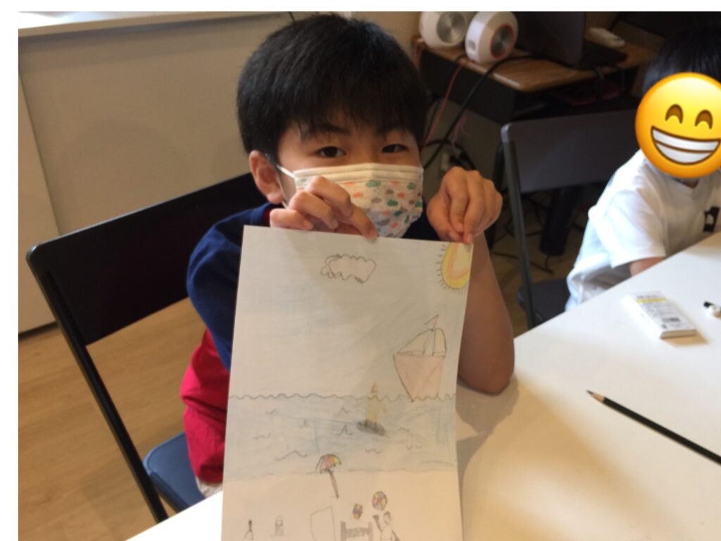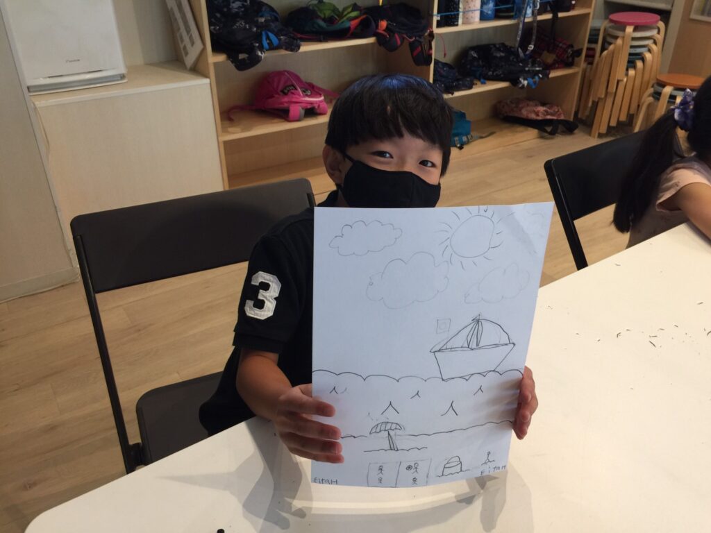簡単なボートやビーチパラソルの絵を完成させたあとは