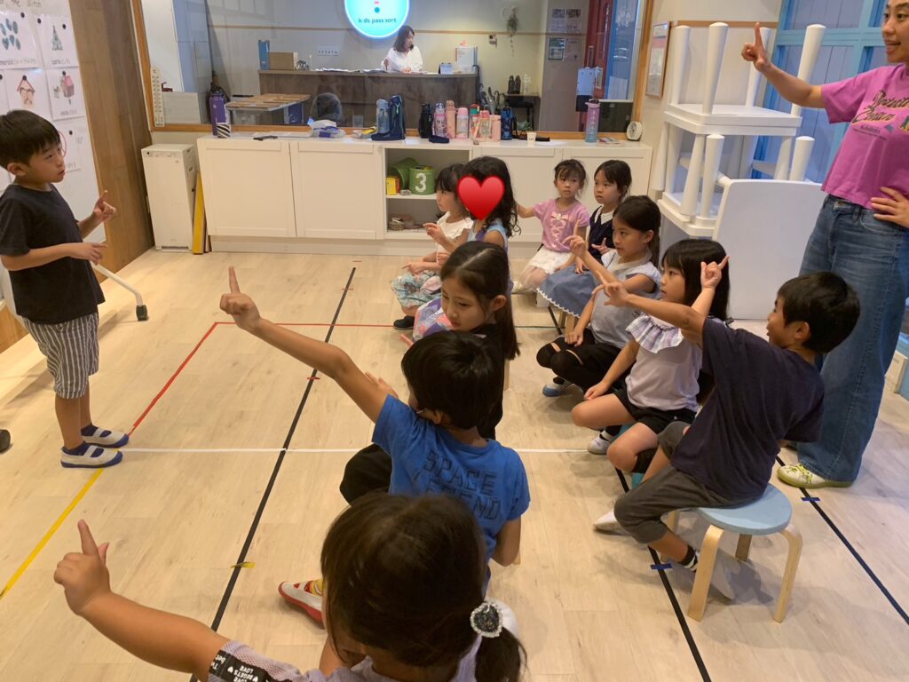 残りの子たちは先生のジェスチャーのお手本を見つつ、お友達を助けます。