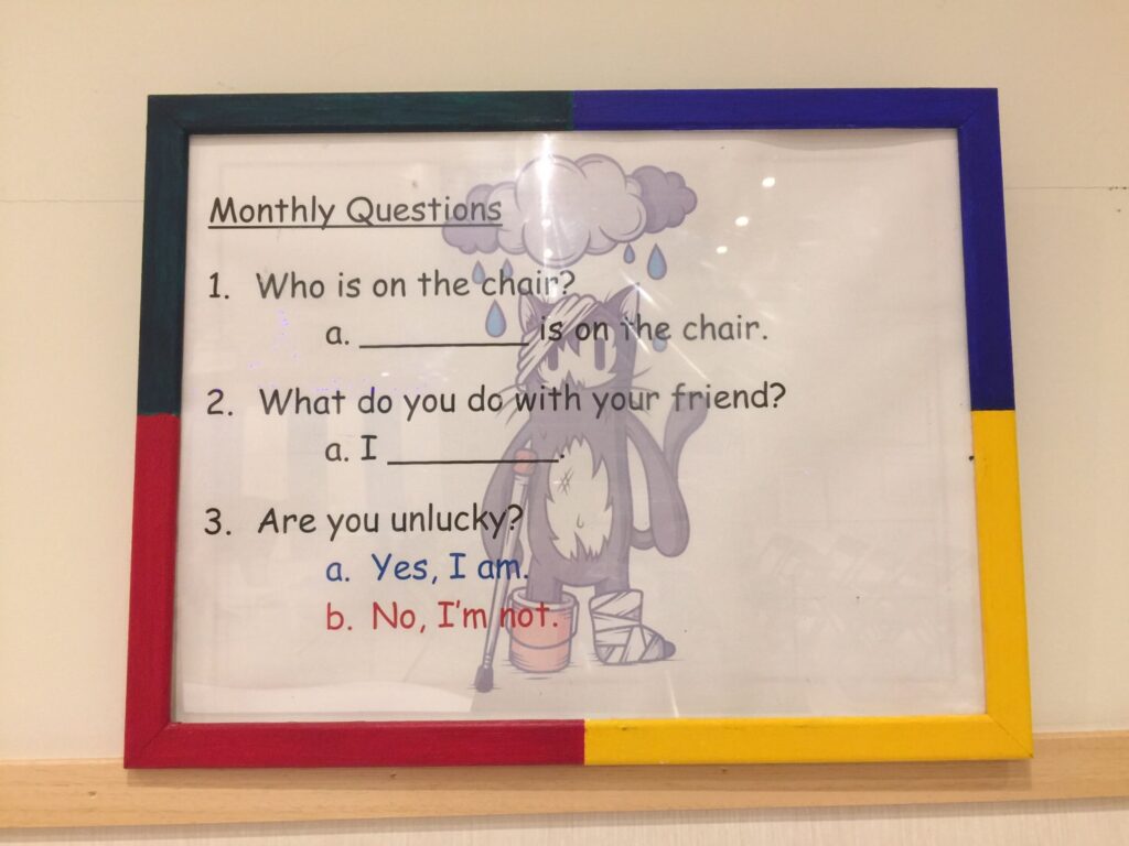 1.Who is on the chair?(だれがイスに座っていますか?)