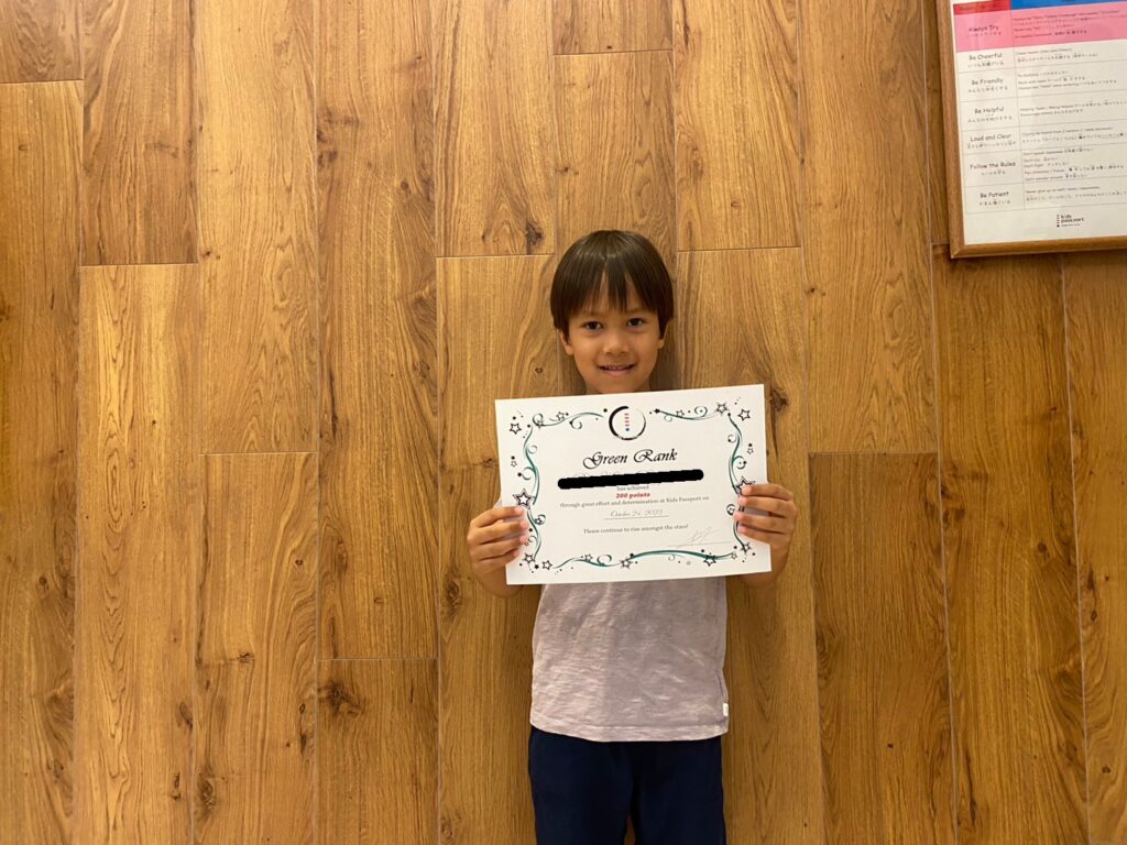 ランクアップするとこのように表彰と、スクール内でのお買い物で使える、キッズパスポートポイントがもらえます!