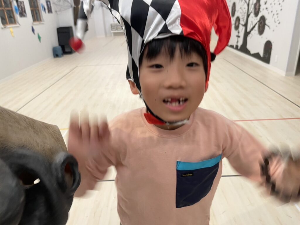 その後も先生が馬の被り物を被り、子ども達を捕まえようとするゲームも♪