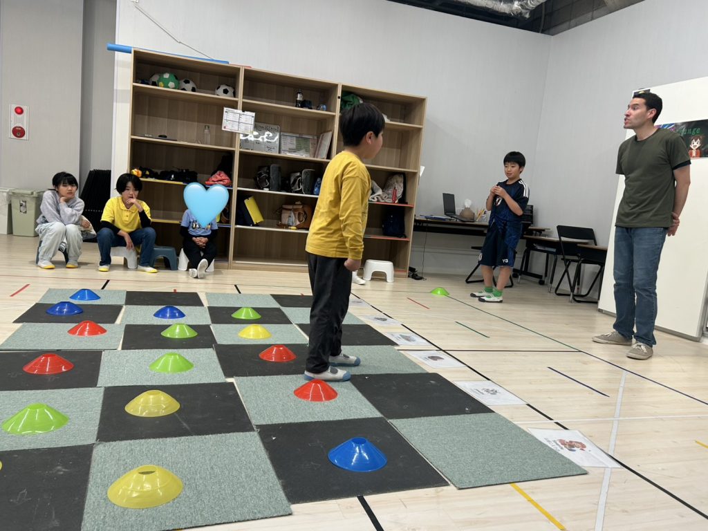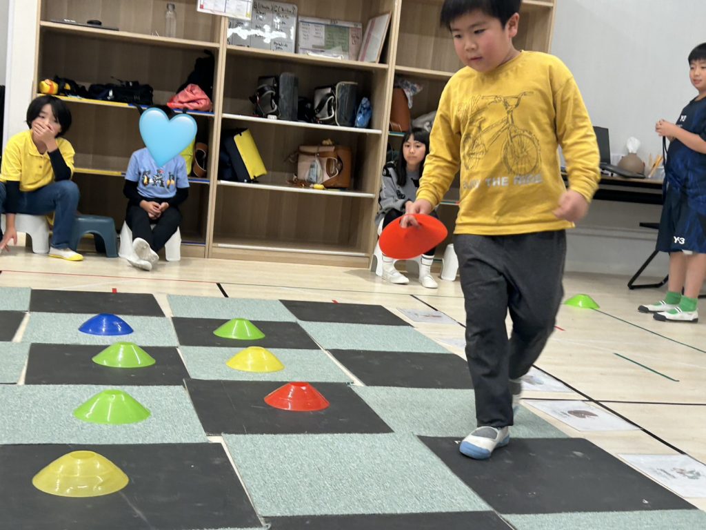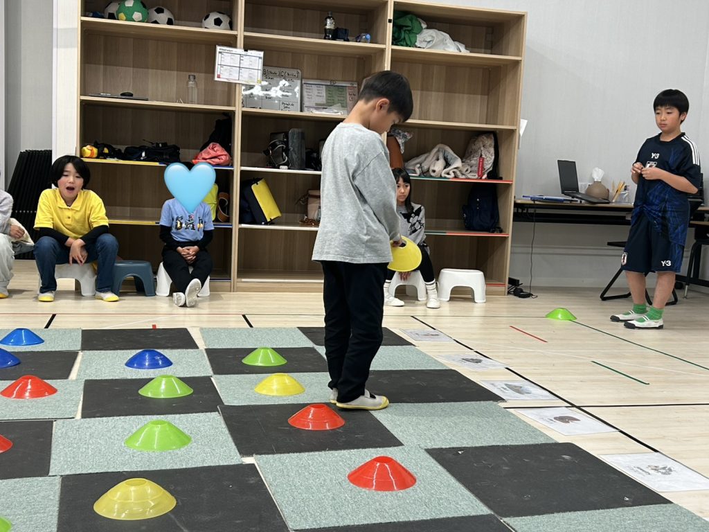 今週は3マス並べゲームを行っています!ビンゴのように縦・横・斜めどれか3マス埋められたらポイントがもらえるのですが、持ち時間は10秒しかないので、コーンをどこに置くかじっくり考える時間はあまりありません!チームの声がけが非常に重要なゲームとなっています!