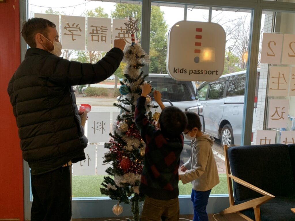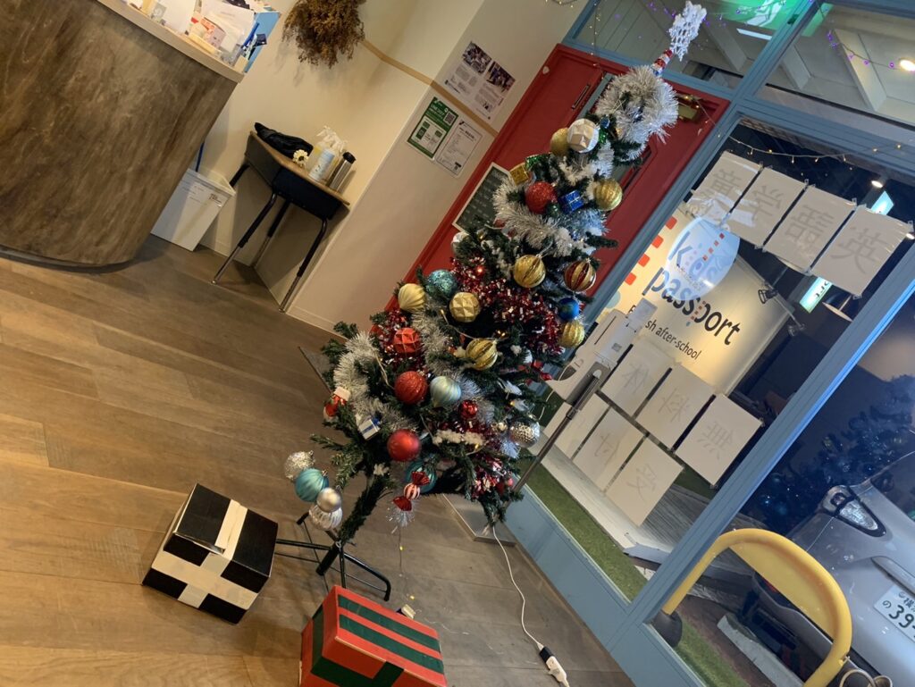 クリスマスツリーや教室にオーナメントやライトを