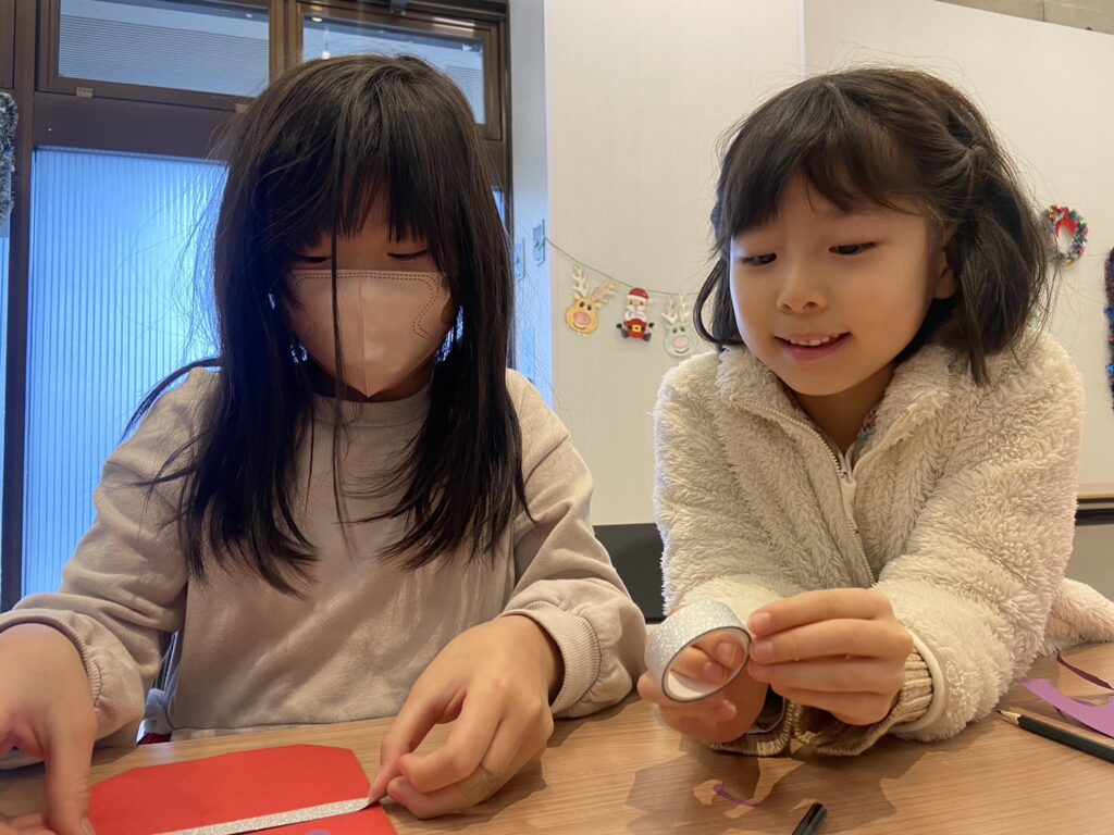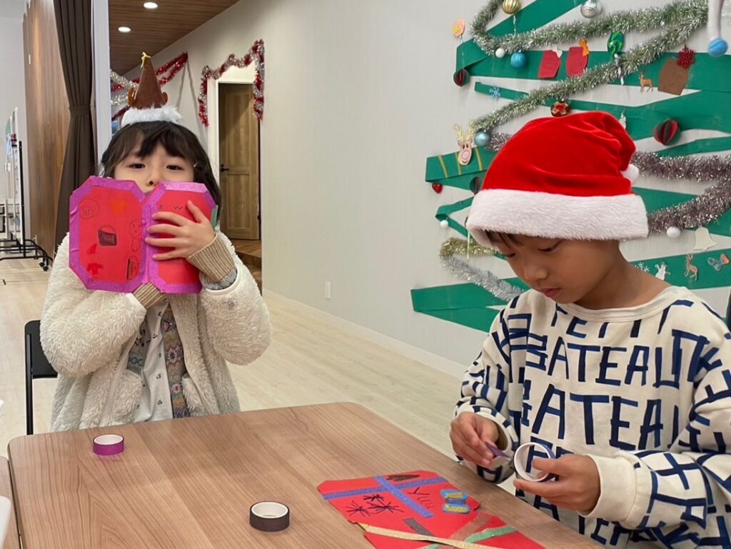 と皆テープでクロスを作り、本格的なクリスマスプレゼントのようなレターに♪