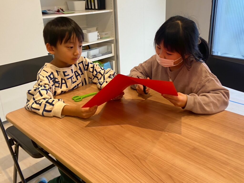 (わぉ、皆赤ほしい!?じゃあシェアしよう。紙を半分に折ってどちらかが切って。)