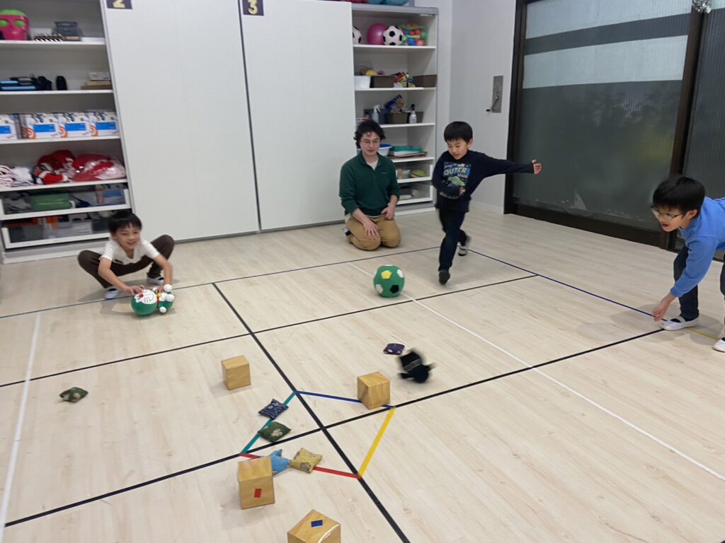 お手玉でボックスを当てるゲームでは、ボーナスポイントととしてお手玉以外にボールをもらい、皆全力!