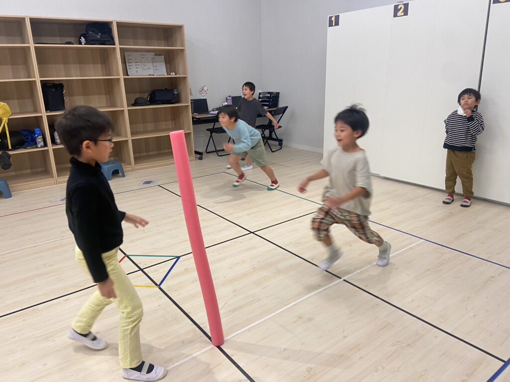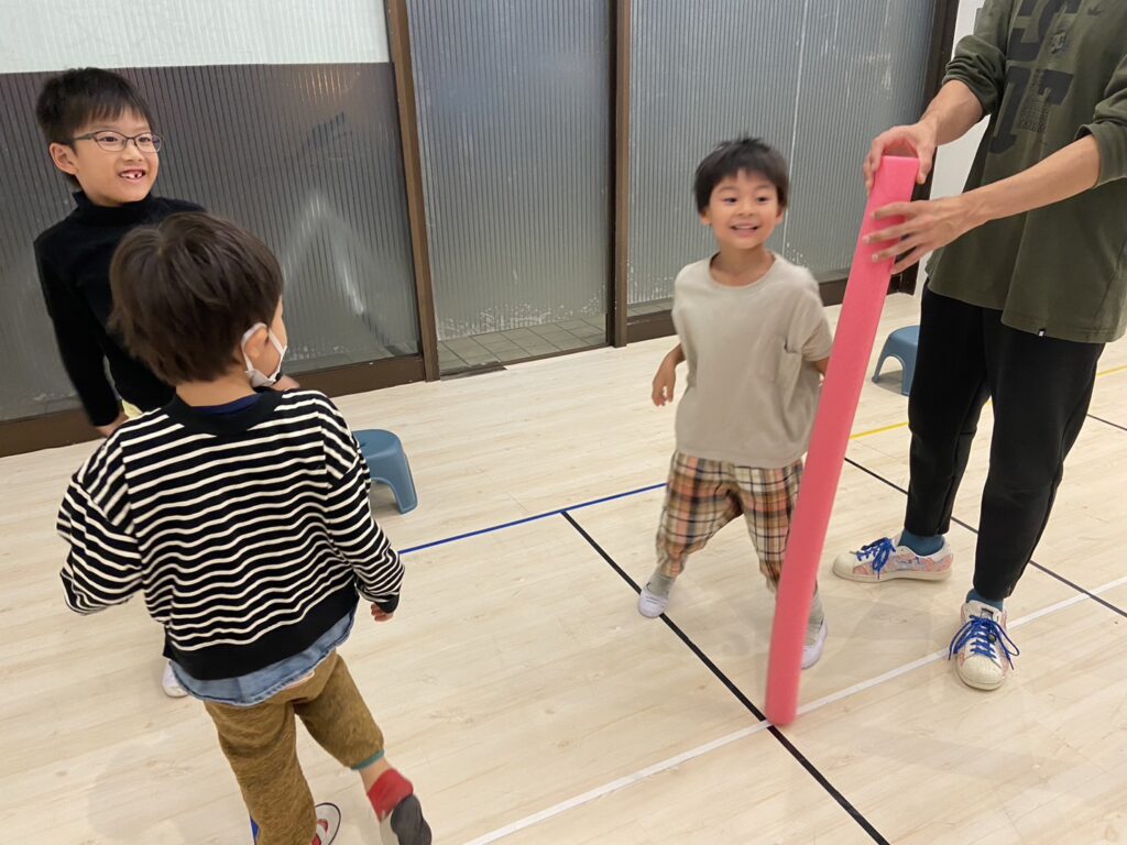 先生が柔らかいポールを持って来てゲームの説明をします。