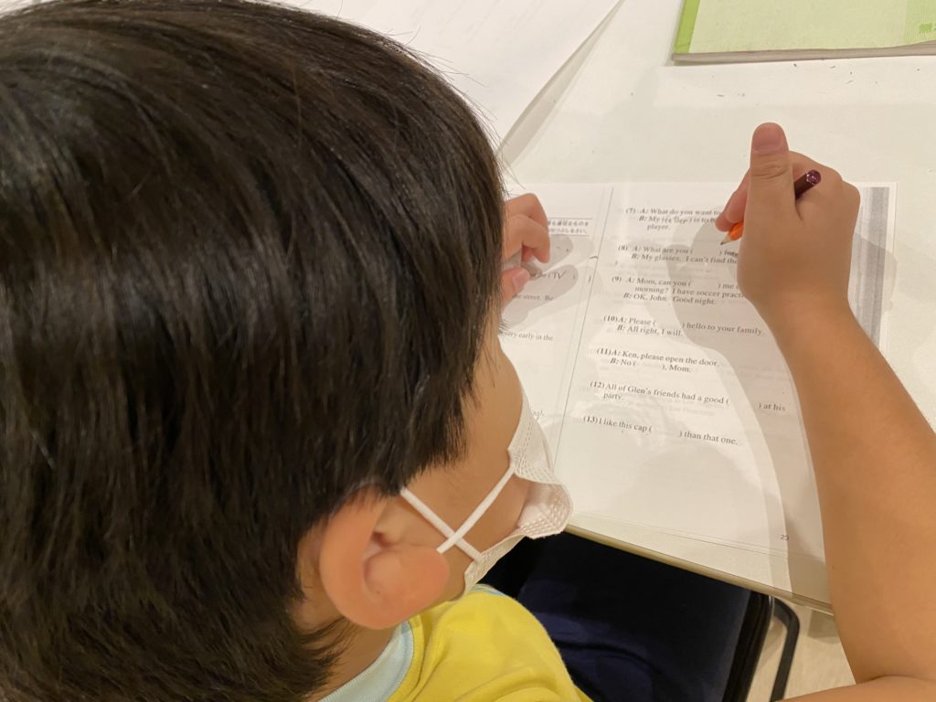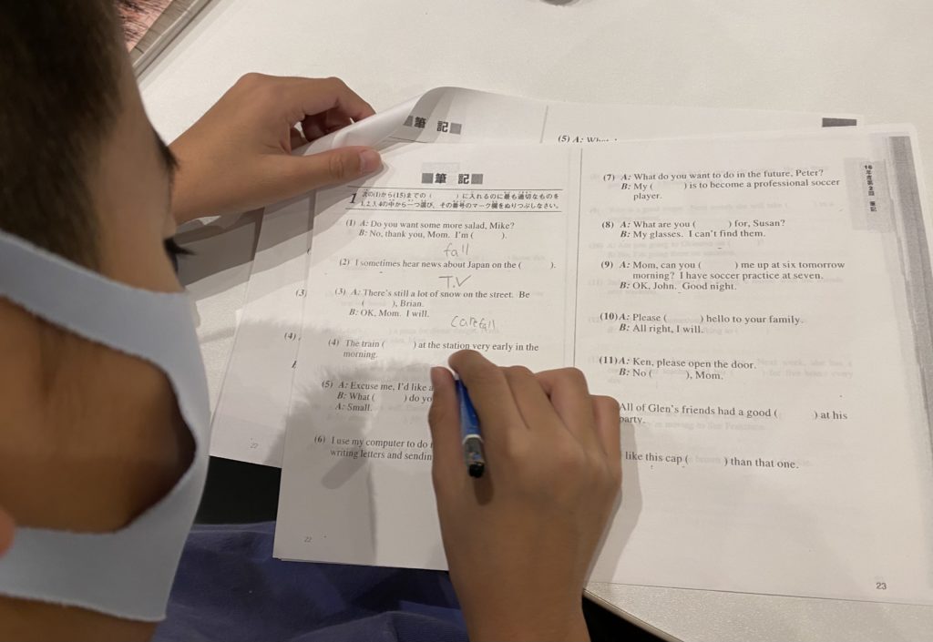 英検5級、4級と3級の過去問題の選択肢の部分を消して、自分たちの実力で正しい答えが導き出せるかな?のテストをしました。