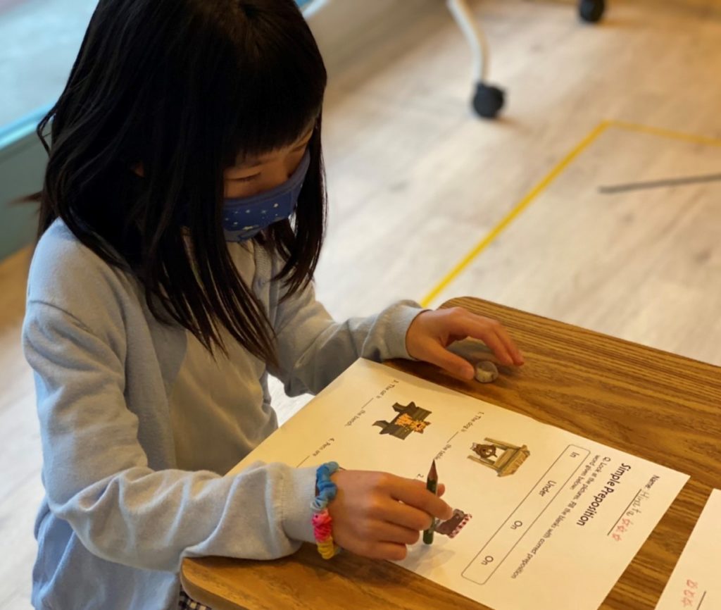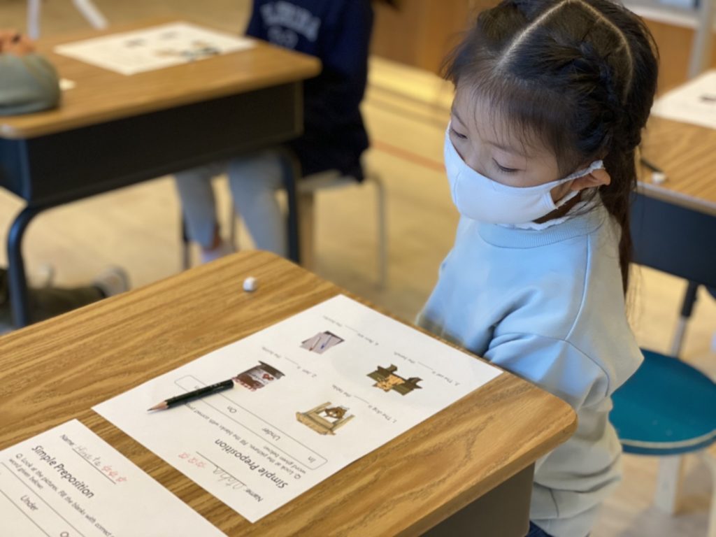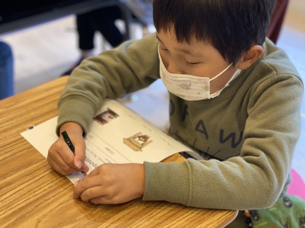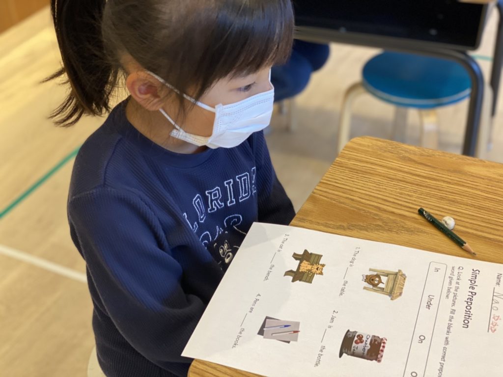 初級クラスはon, in, under(~の上、~の中、~の下)の意味や使い方を練習した後にライティングの練習をしました