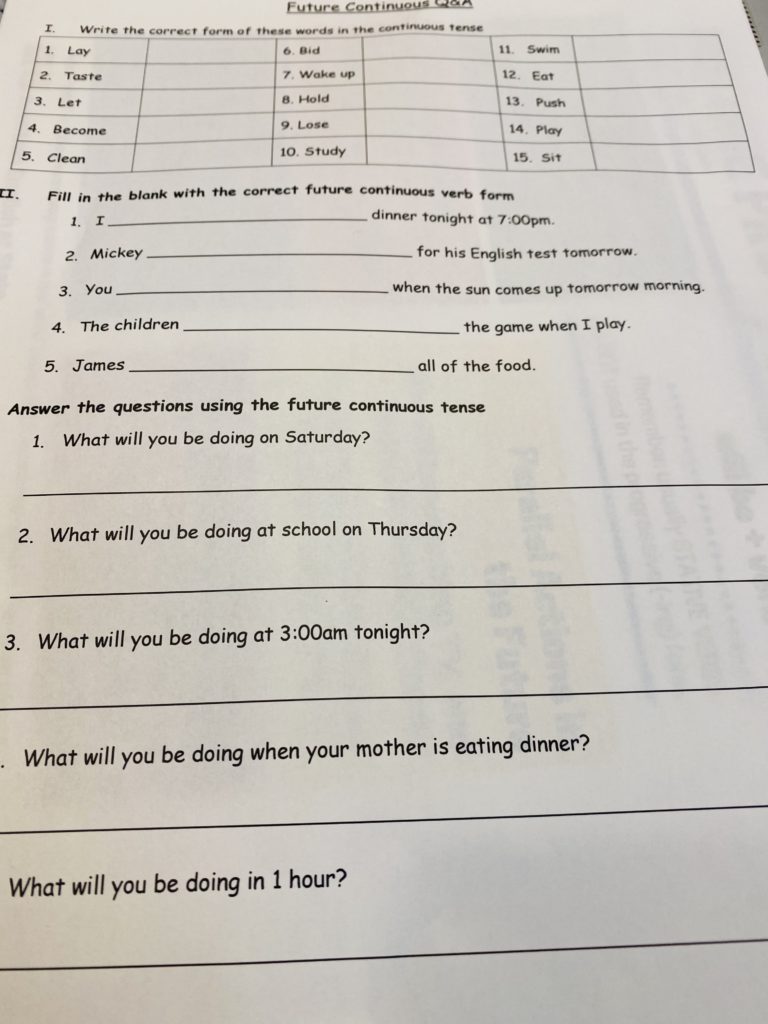 Write the correct form of these words in the continuous tense.(これらの単語の正しい進行形で書いてください)