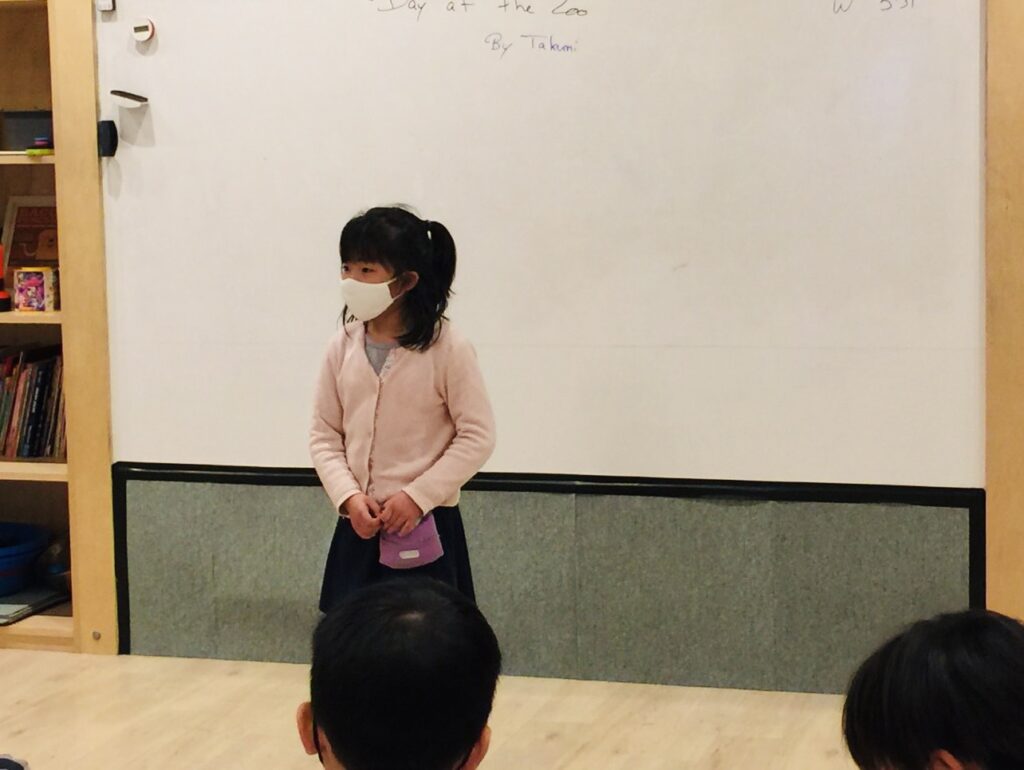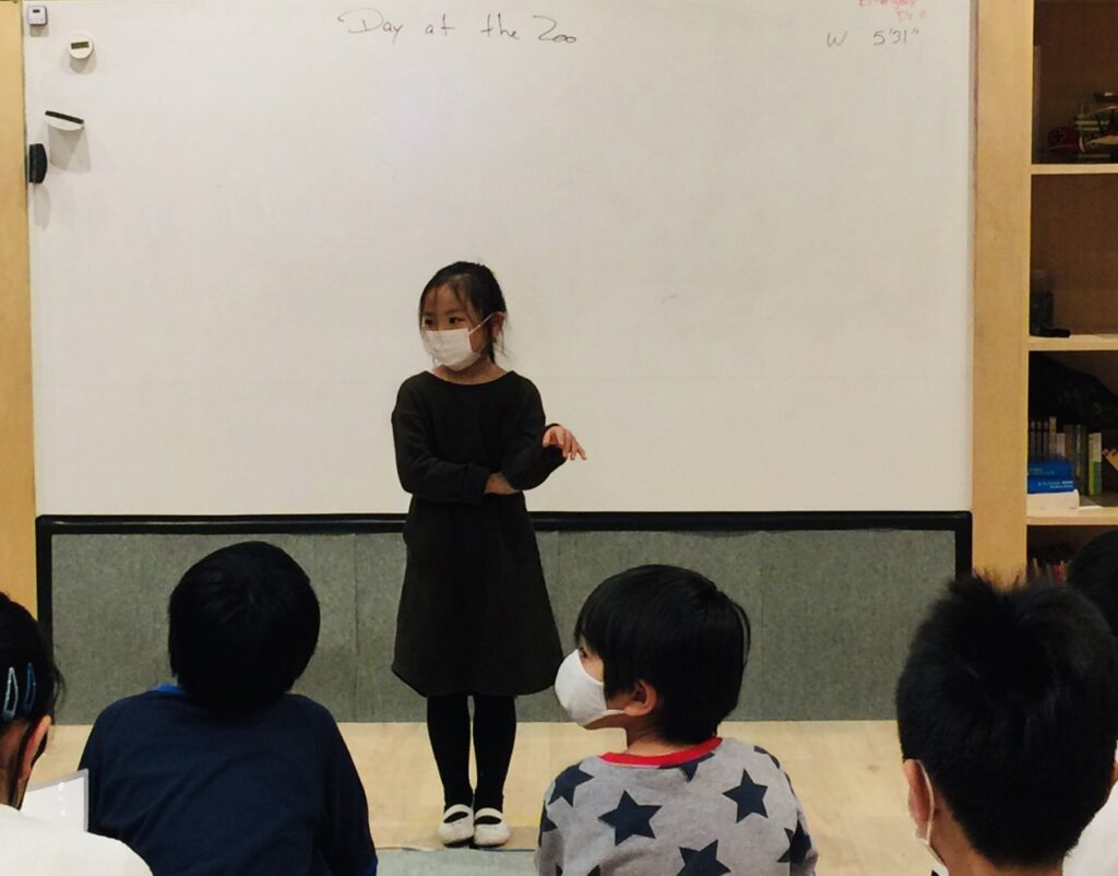 お友だちが前に出て発表をしていると、Pre Area(初級エリア)のみんなは教室の後ろの方で一生懸命、ジェスチャーをして助けてあげてくれています。