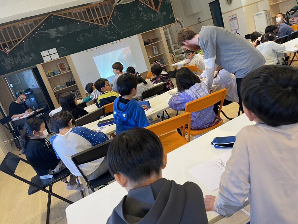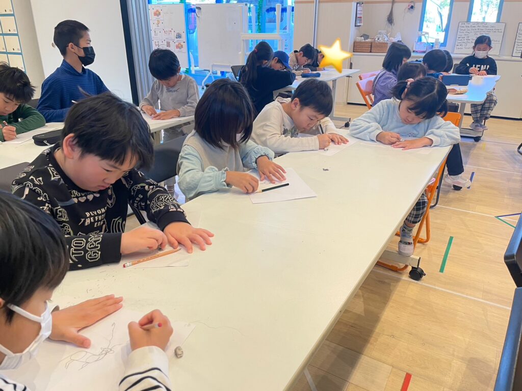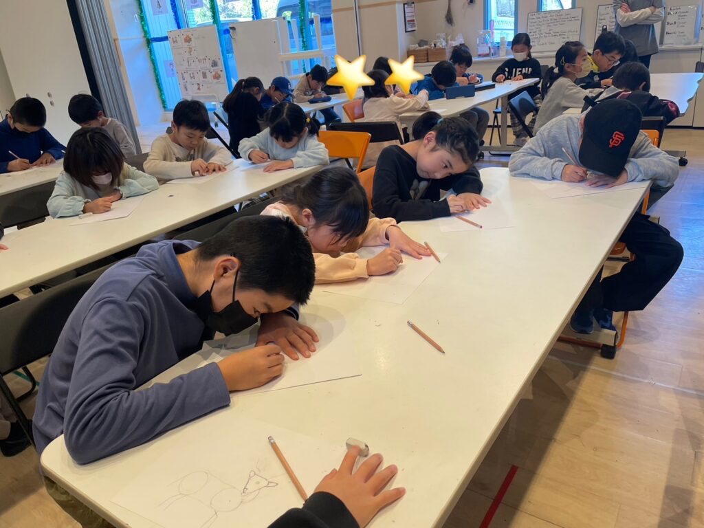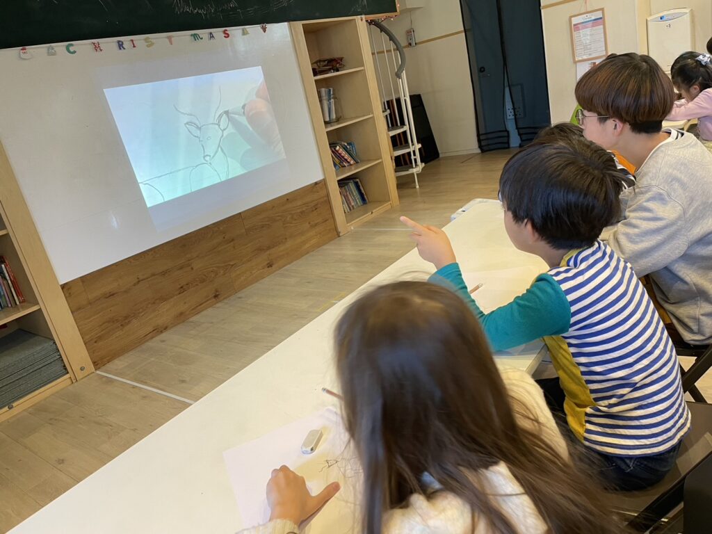 (今日はトナカイを描くよ!最初に先生が描き方を見せるから、そのあとにみんなはやってみて!)