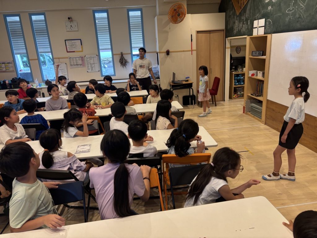 次に、チーム対抗で質問フレーズに回答の練習をしました。フレーズを少しずつ聞き慣れ始めた生徒もいて答え方を覚えていきました。