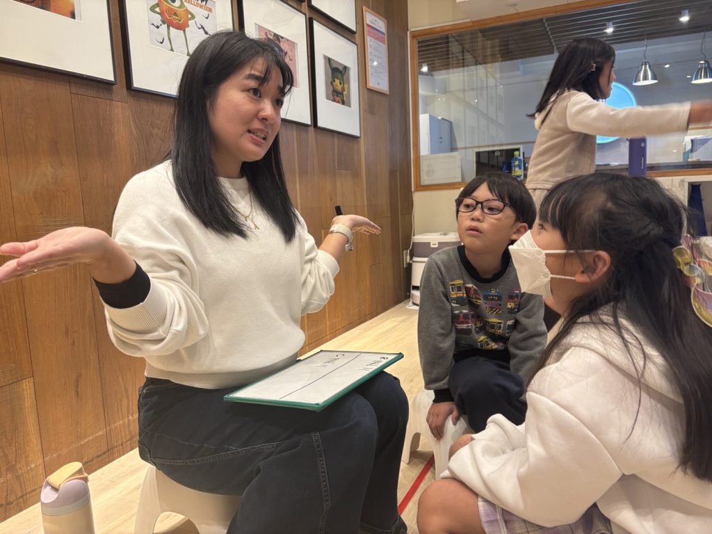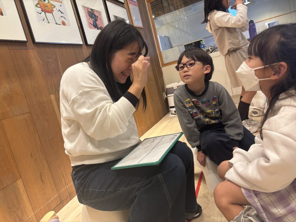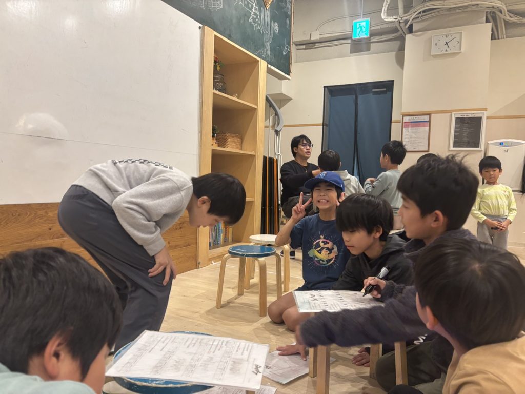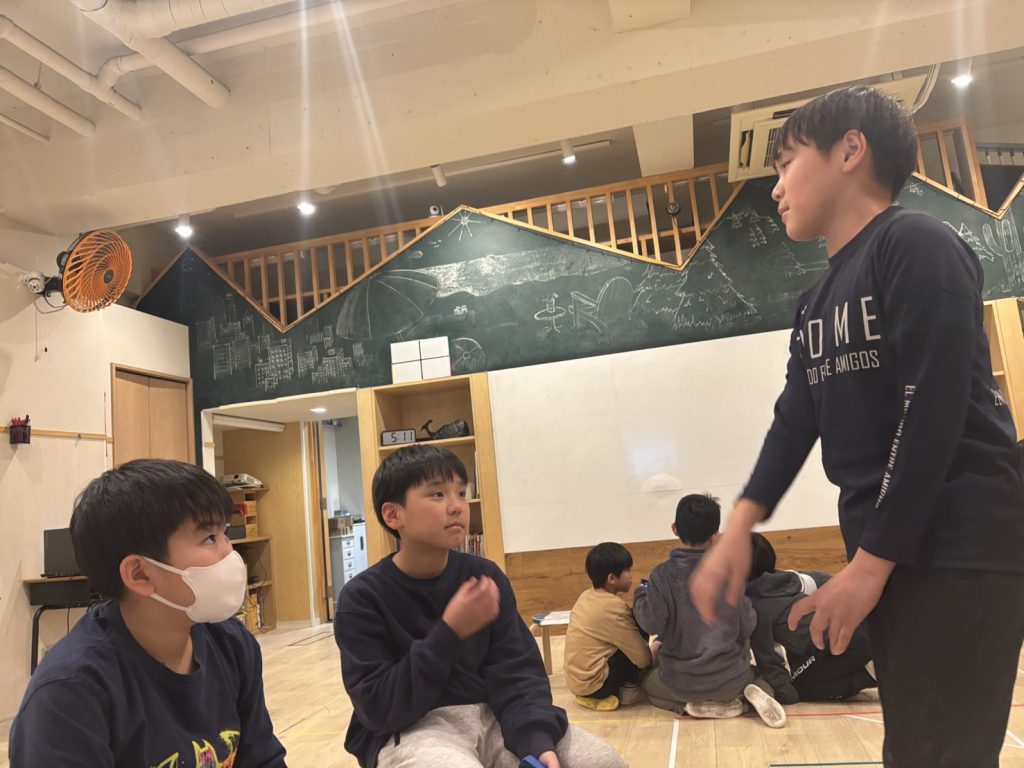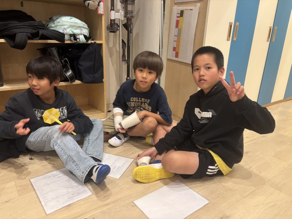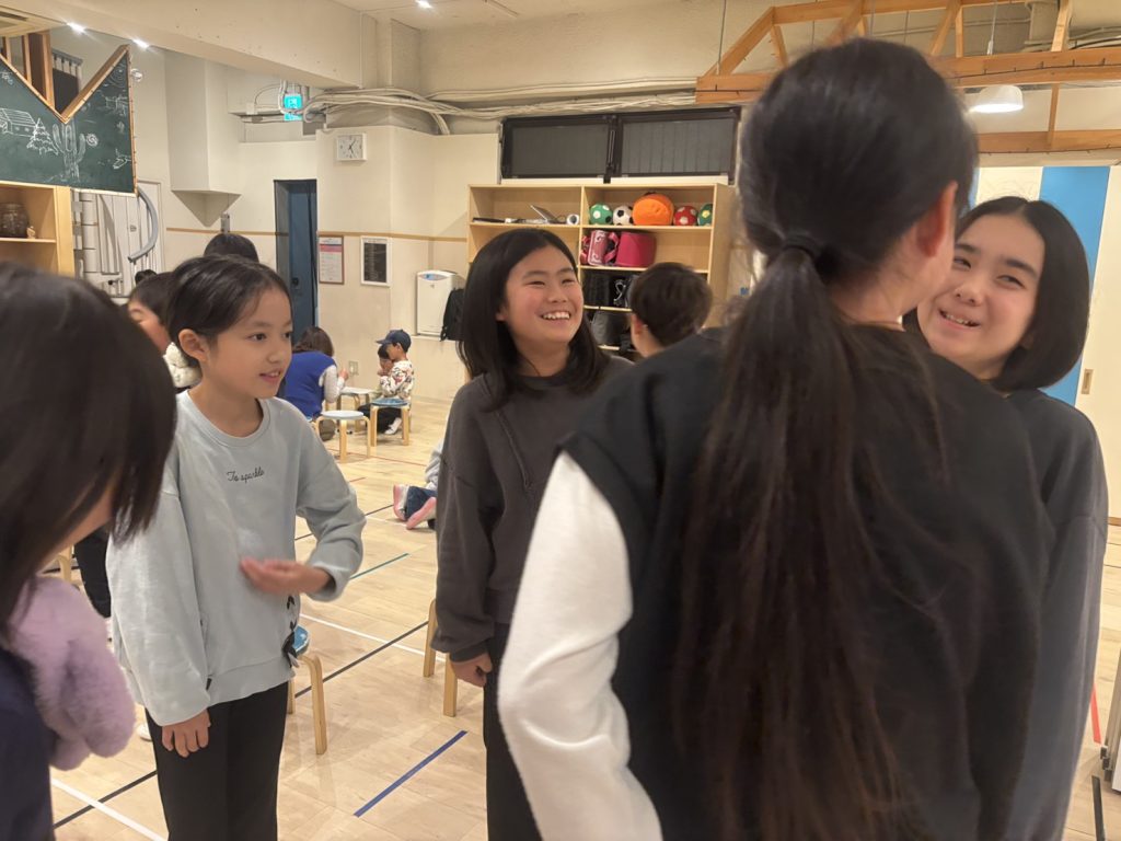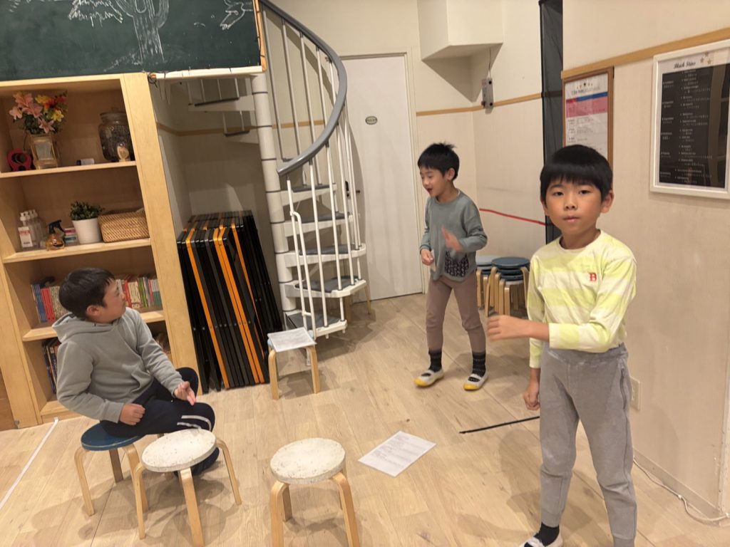 すでに、小道具を用いてストーリーを面白くする工夫が見られたり、ペアやグループになってお互いの練習を採点してみたりと、力を合わせて練習する姿が多く見られました!