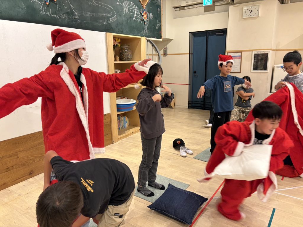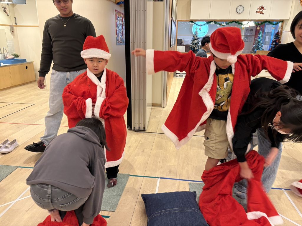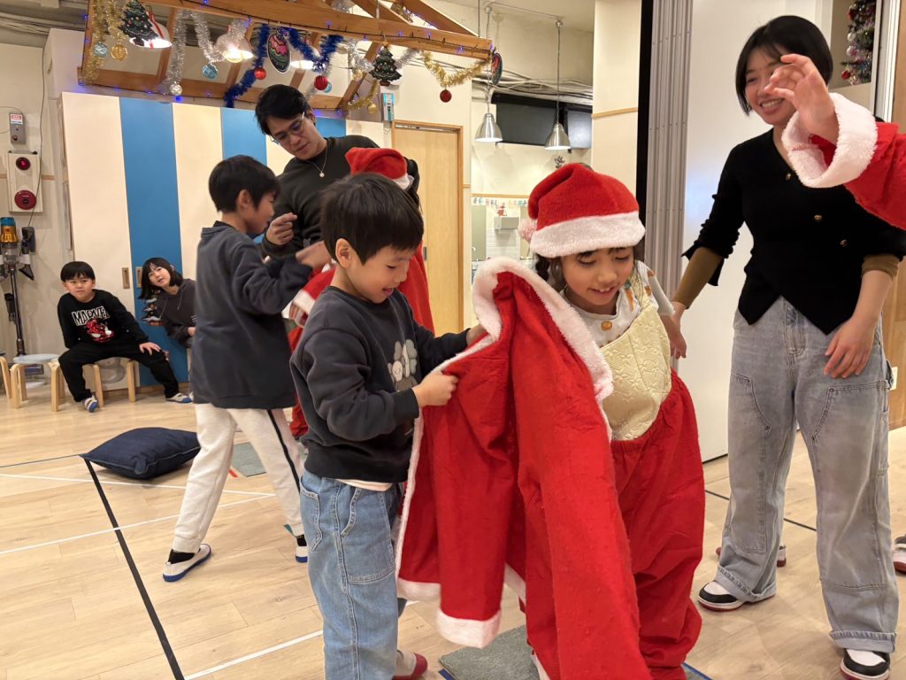 そんな今週のゲームは、クリスマスにちなんで着せ替えリレーを行っています!各チームから4人を選出し、一人はサンタクロース、他三人は小人さんになってサンタの着替えのお手伝いをします!