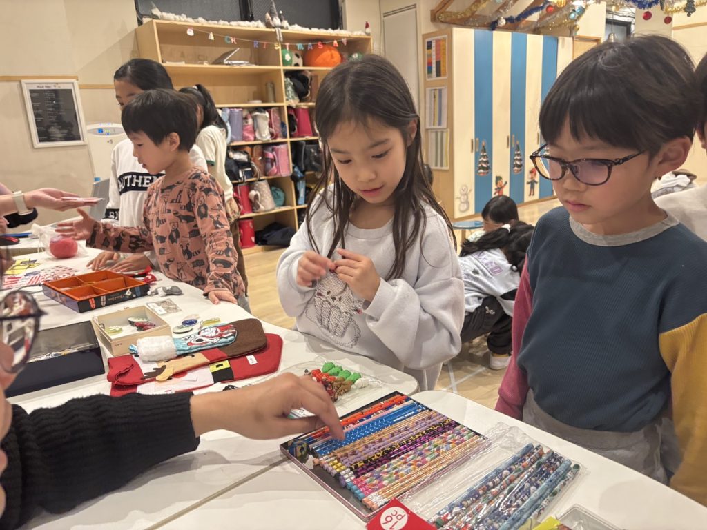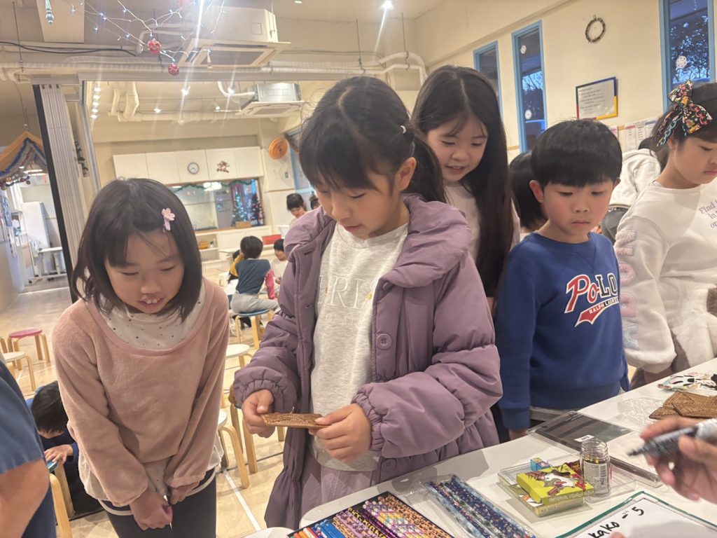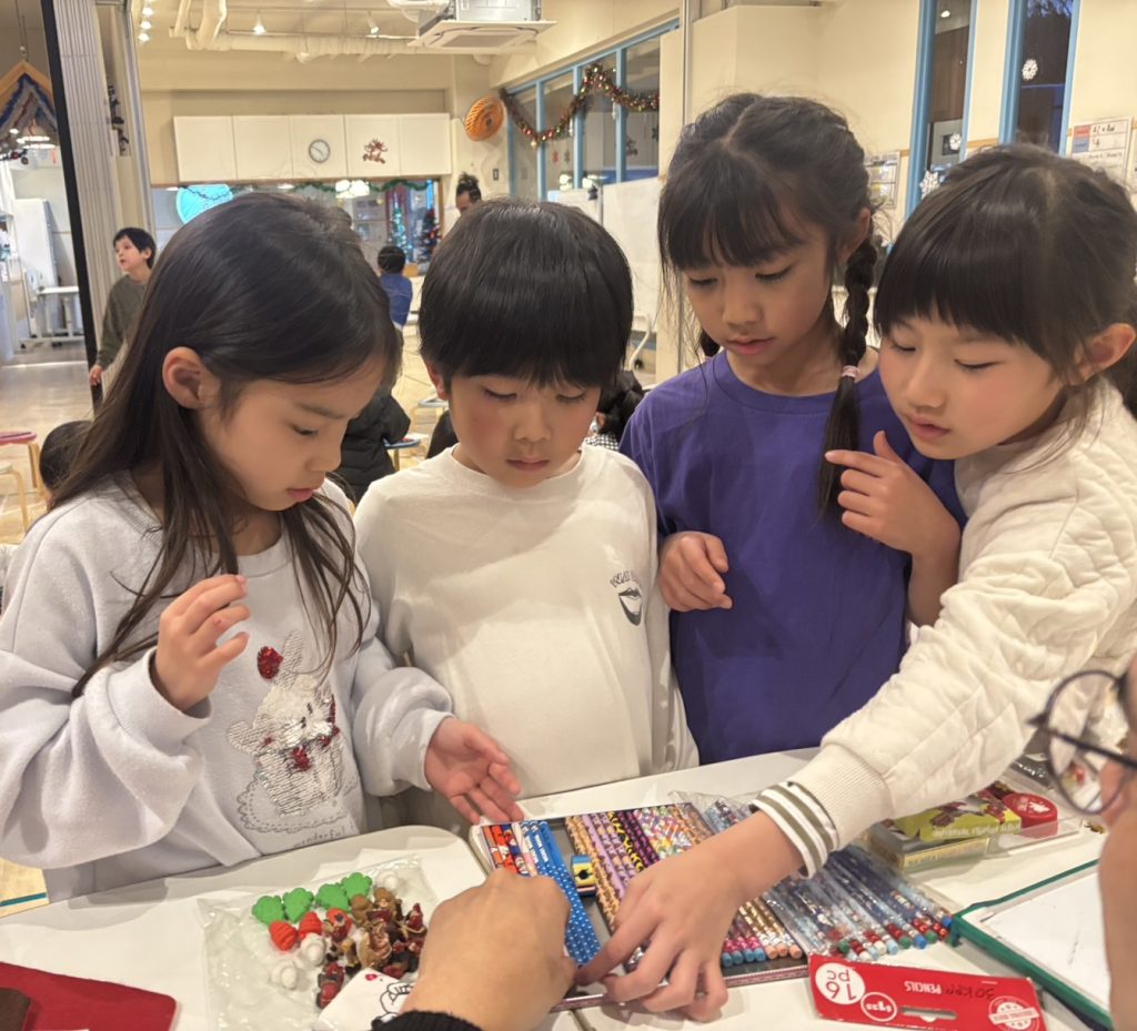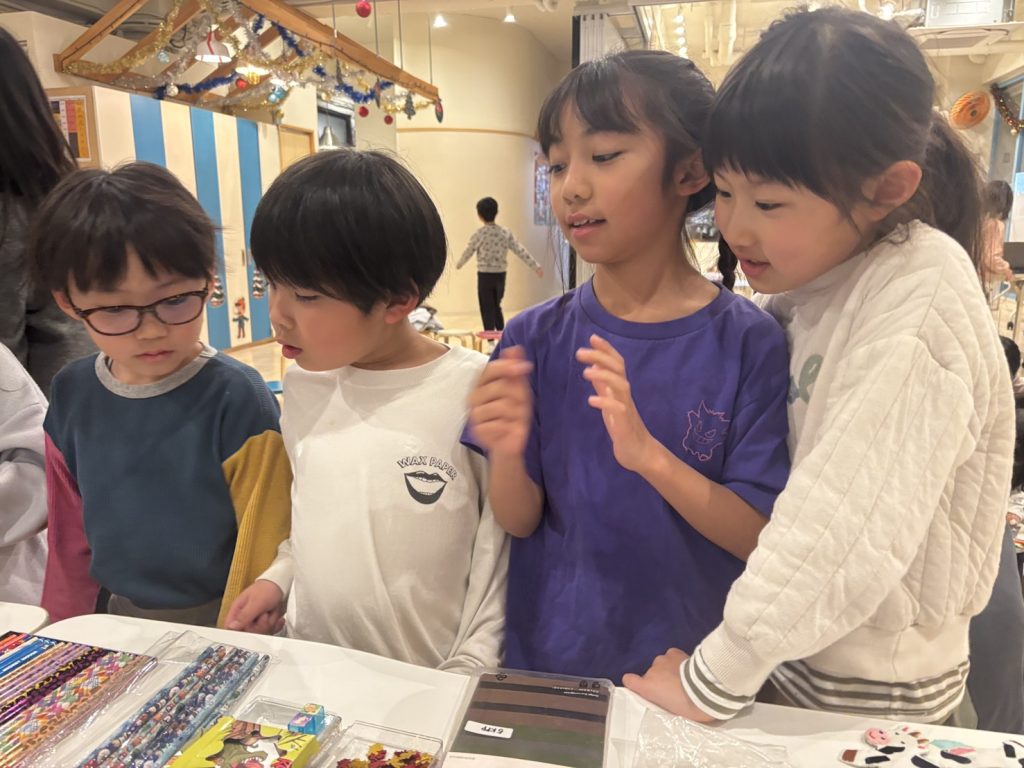 自分が欲しかったものを買ったり今日欲しいものを買ったりと、それぞれに買い物を楽しみました。鉛筆、ぬりぐるみ型の筆箱、ステッカーなど。最終日ともあってか、生徒たちはじっく見ながら欲しいもを見定めている様子でした。