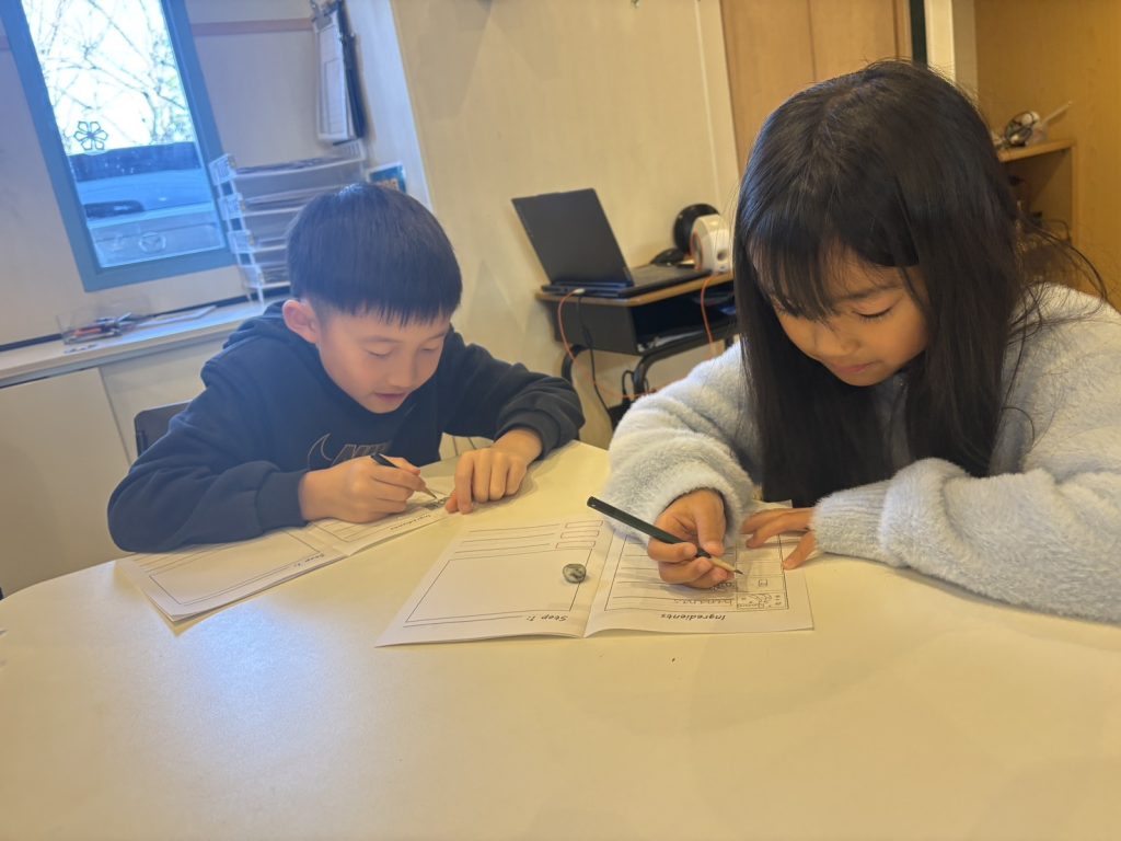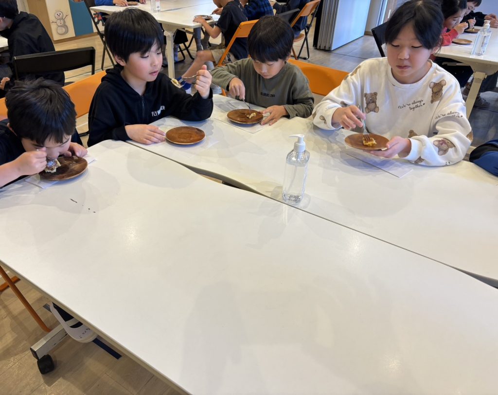 ④Fry (焼く): いよいよお楽しみの焼きに入りました。教室中に、甘い香りが立ち込めてきて、生徒たちは焼き上がりが待ちきれない様子でした!