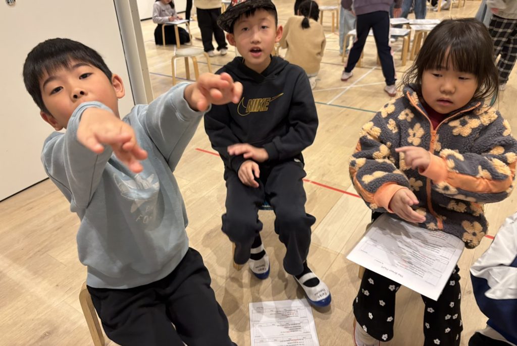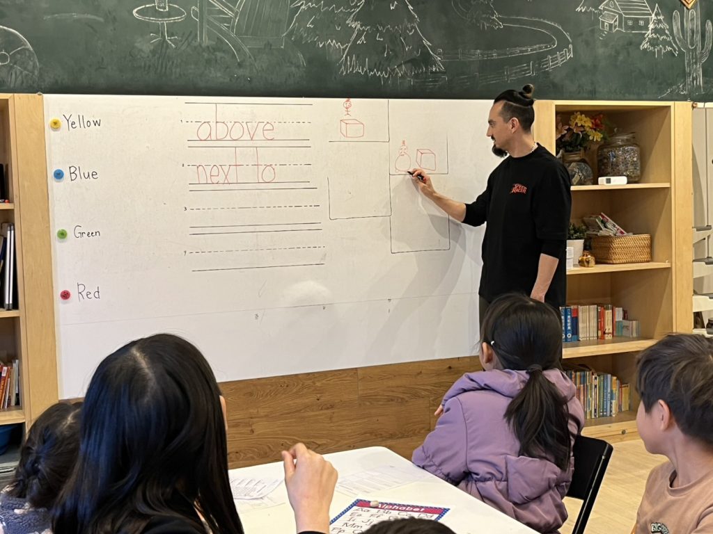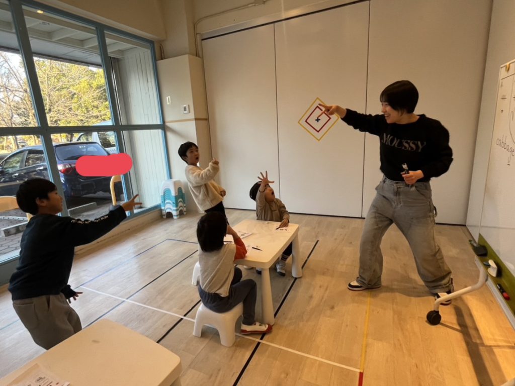 先生はこどもたちが飽きないで楽しく学べるよう、Next to (~のとなりに)ではトトロを描いて、そして顔のパーツは自分にし、”となりのJames(ジェームス先生)”と話しながらレッスンを進めました (笑)