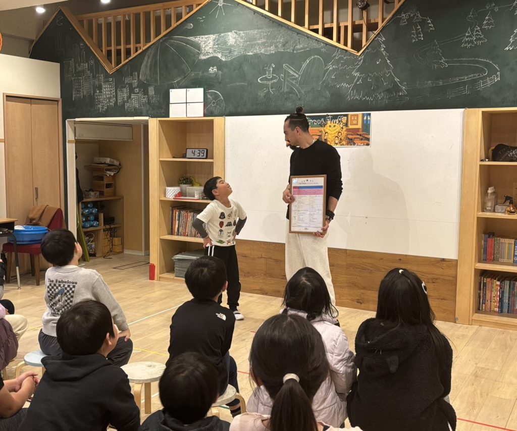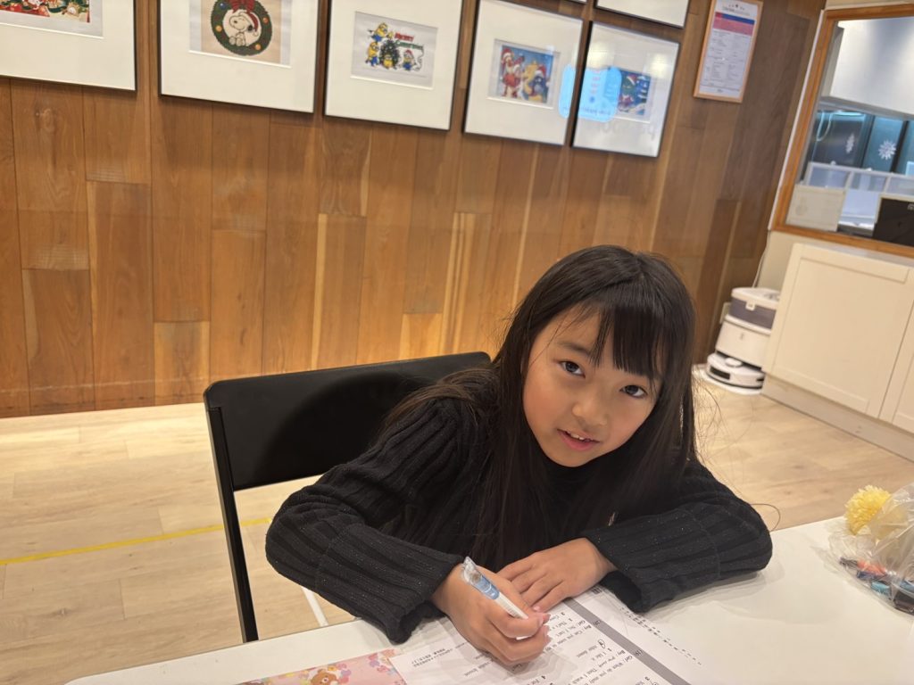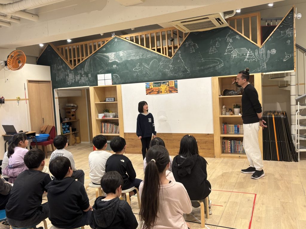 次に、スピーキングテストをしました。これは実際に録画し、生徒たちの答え方や英語力の上達を確認しています。緊張しながらも、先生からの質問に答えていきました。