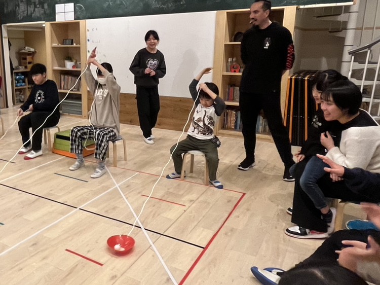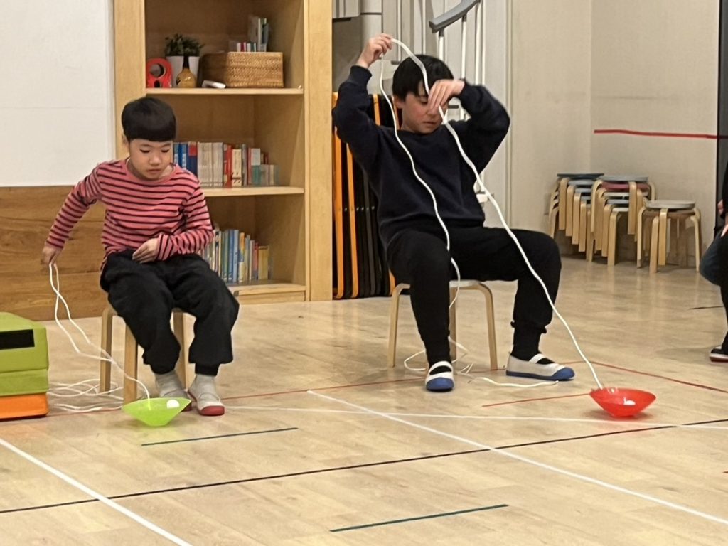 そしてゲームの第二段階は先生が言うボキャブラリーの中で、正しい言葉を言ったら、ひもを引っ張りゴールを目指します。急ぐあまりに、ボールを転がしてしまう子、慎重にゆっくり進める子それぞれのペースでがんばりました!