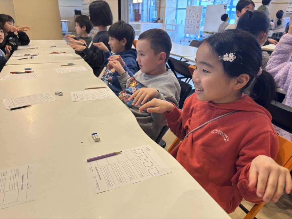 単語学習の途中で、いきなりのクイズ!各単語にジェスチャーを付けました。まずは、みんなで練習です。ルールは、対象の単語が聞こえたら素早くジェス!チャーを合わせます。