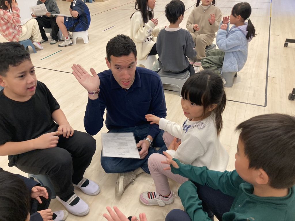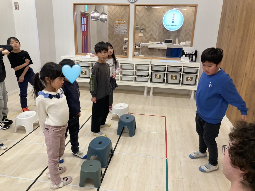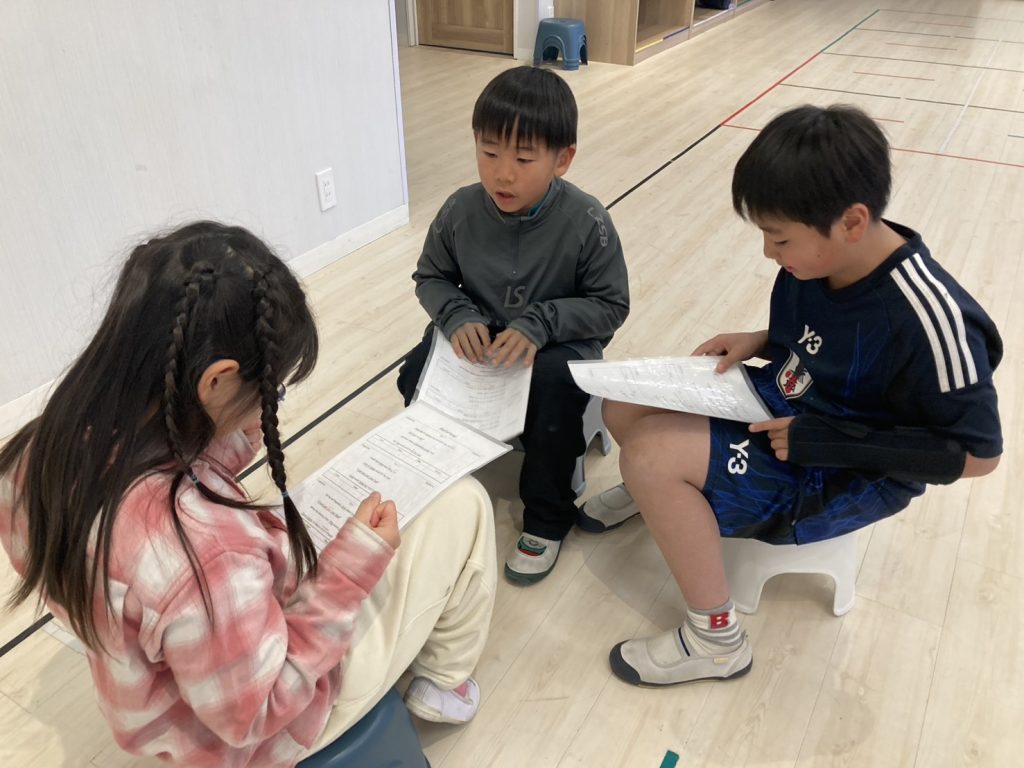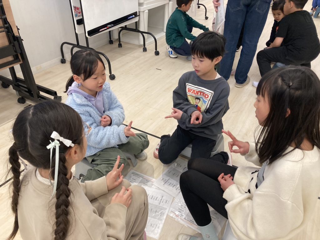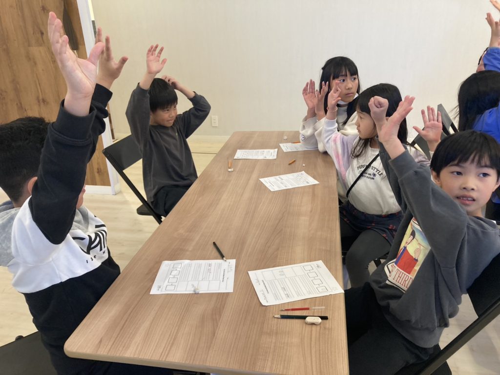 先生: Today’s game is an “Escape Game”! Find the exit card from the smoke on the floor. If the card has a word, read it in a loud voice! Got it? Let’s start playing!(今日のゲームは「脱出ゲーム」だよ!床の煙の中から出口のカードを探して。単語が書いてあったら大きな声で読んでね。分かった?さあ、はじめよう!)
