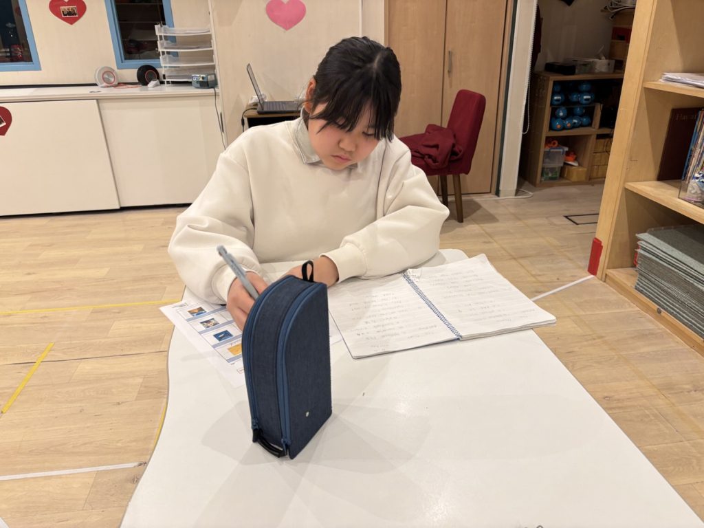まずは、筆記テストです。今回のユニットで学習した単語から取り掛かりました。イラストのヒントを頼りに単語を書きました。次に、英文の質問に自分の経験から答えを書きました。