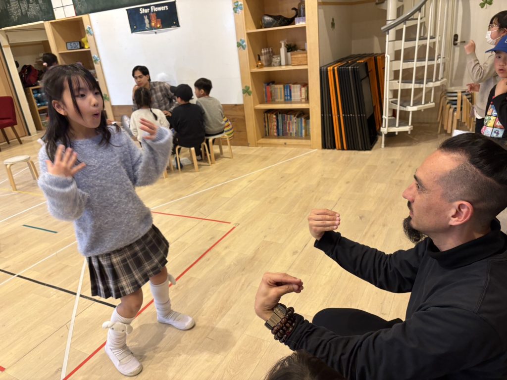 先生: Everyone, finger up! Good. Now, what finger in Japanese?(みんな指を挙げて!フィンガーって日本語でなんて言うんだっけ?)
