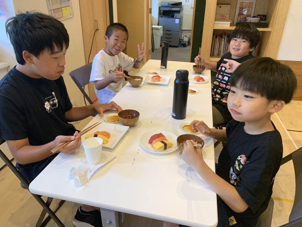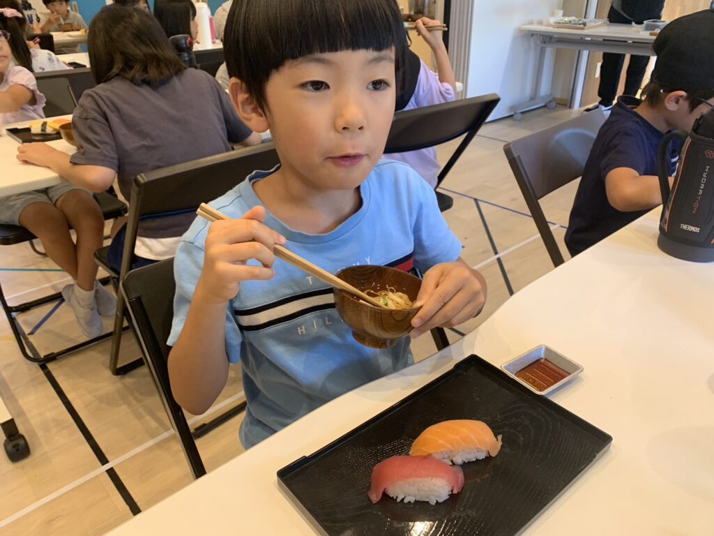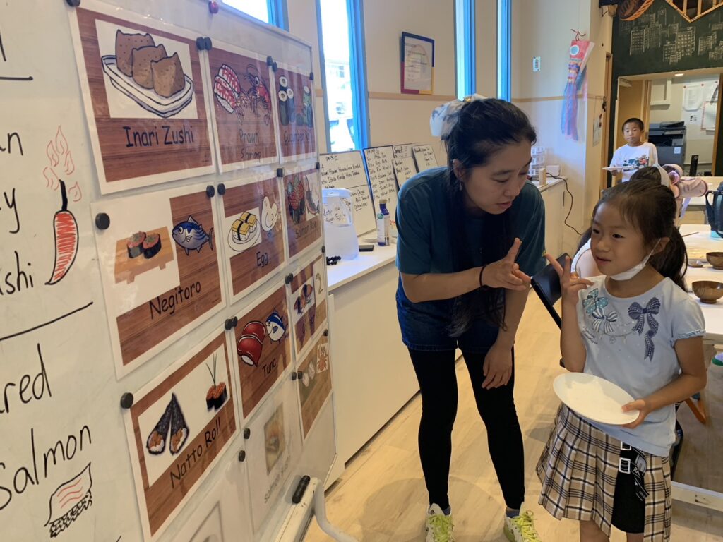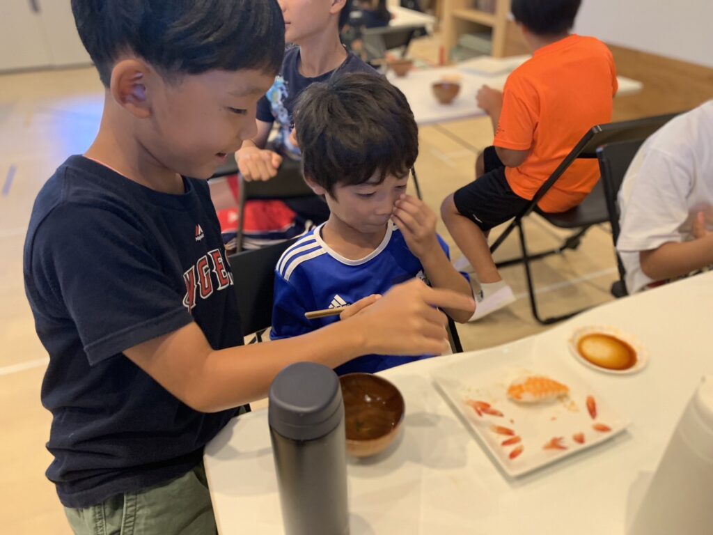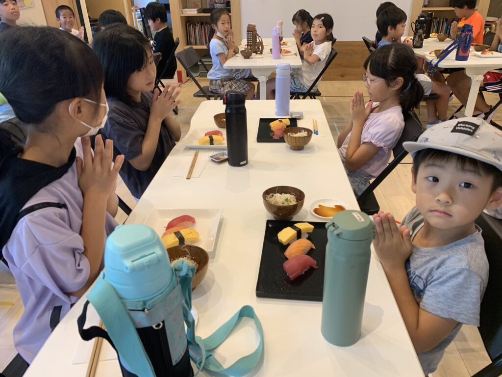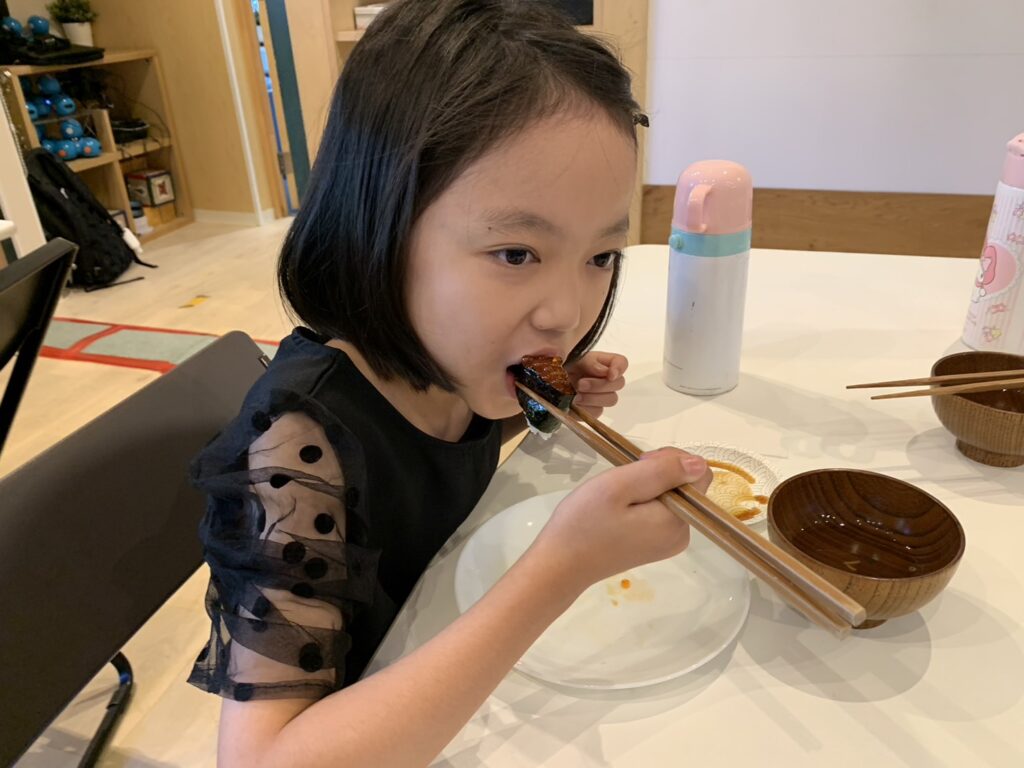 (ねえねえ、エビのすし、いくつ食べたの?)