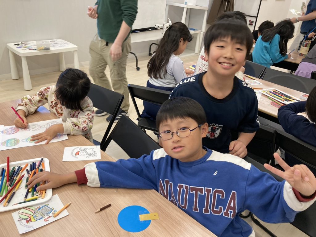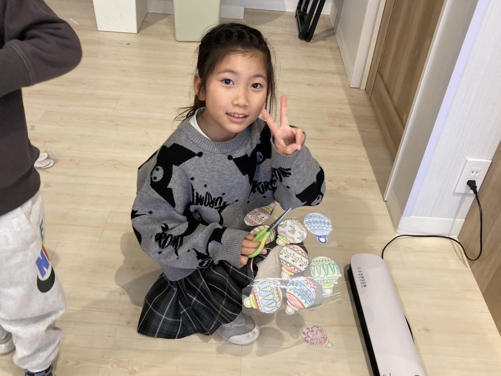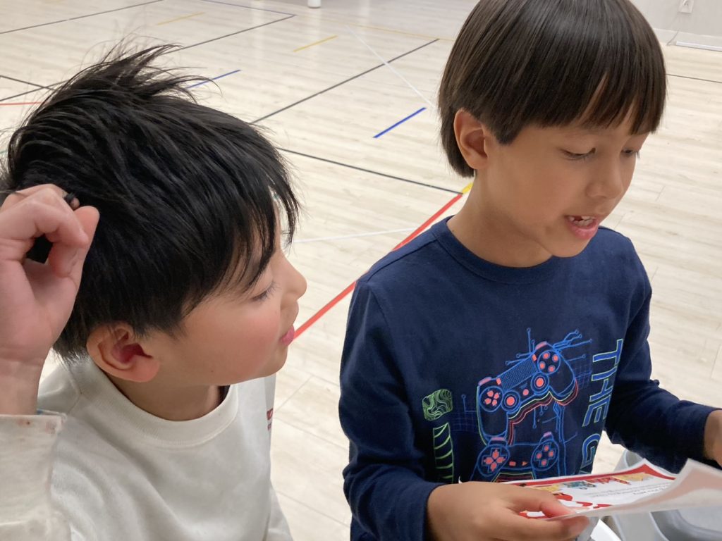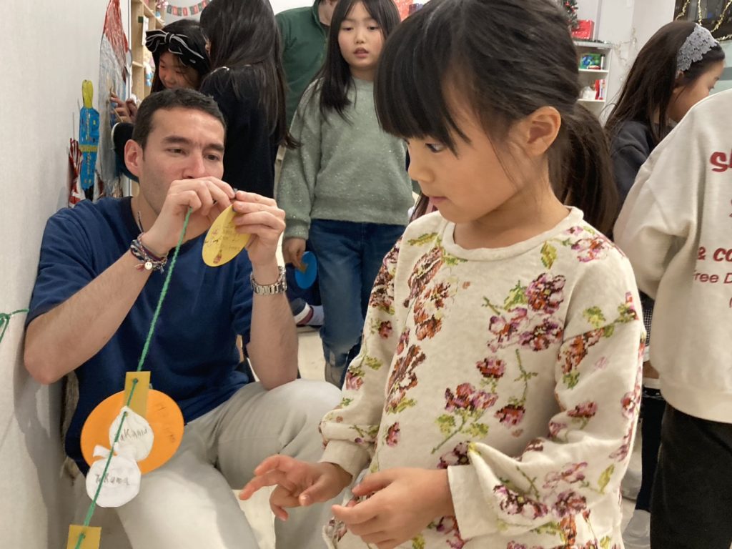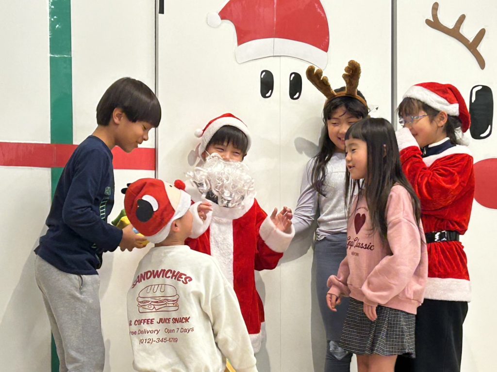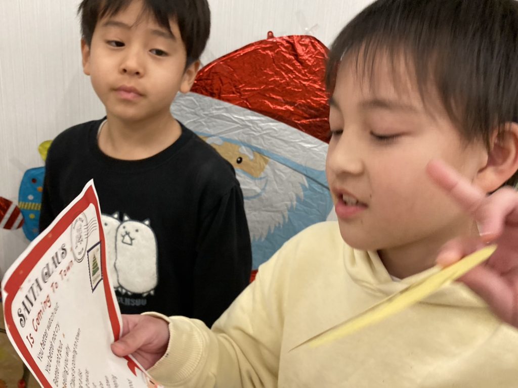 明日はクリスマスイブですね!教室もクリスマス仕様にチェンジしています!そんな今日は、みんなが今まで作ってくれたオーナメントを一番大きなツリーに飾っていくアクティビティをしました!今年のクリスマスに欲しいプレゼントを各々が書いたものも飾っていきます!しかし、ただ飾るだけではつまらないので、クリスマスソングの‘Santa Claus is coming to town’を歌いながらデコレーションしていきました!先生からのミッションは、一番大きな声ではっきり歌えていたチームには、なんとボーナスKPPが!!この歌は、KPのYou Tubeにも先生たちが歌っている動画があるので是非見てみてね!