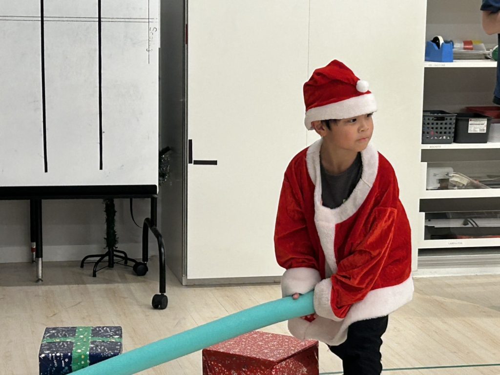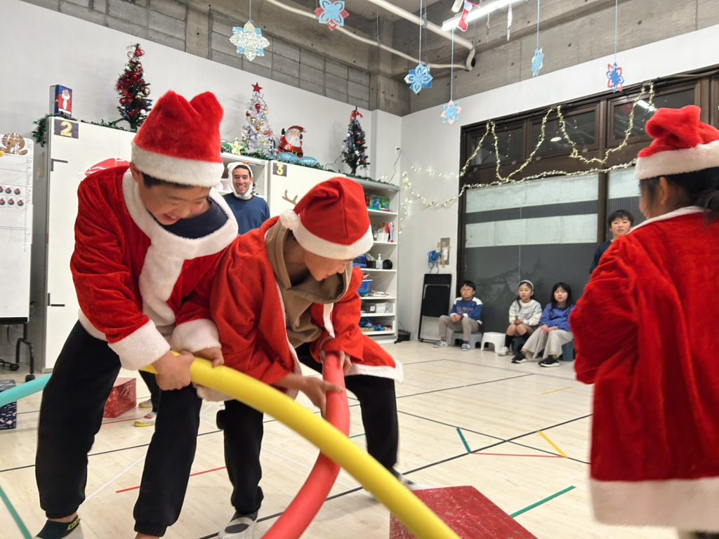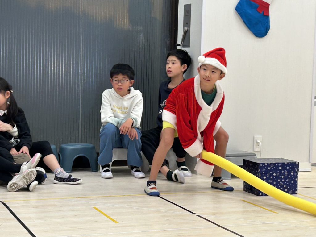 6時のゲームも非常に盛り上がりました!プレゼントの争奪戦なのですが、各チームがヌードルを使って、奪い合います!やわらかい素材なので、コントロールが難しいのですが回数を重ねる度コツを掴んでいくみんなでした!小さいサンタ達がせわしなく駆け回る様子に先生たちもほっこりしました!